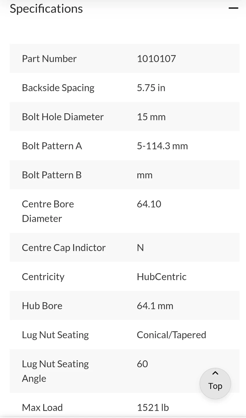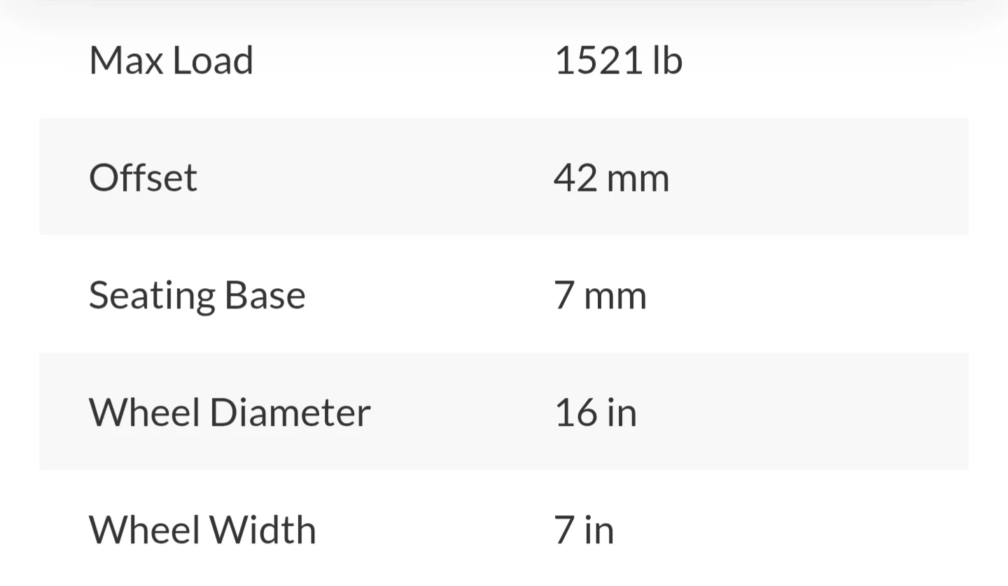 The rims are 16 inches in diameter and 7 inches wide. They have a 5-114.3 mm bolt pattern.