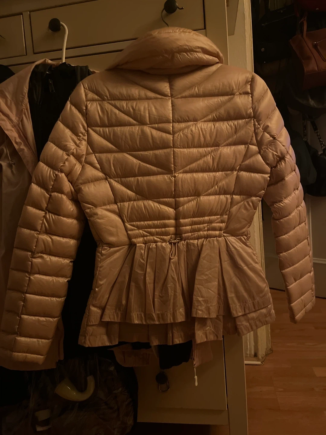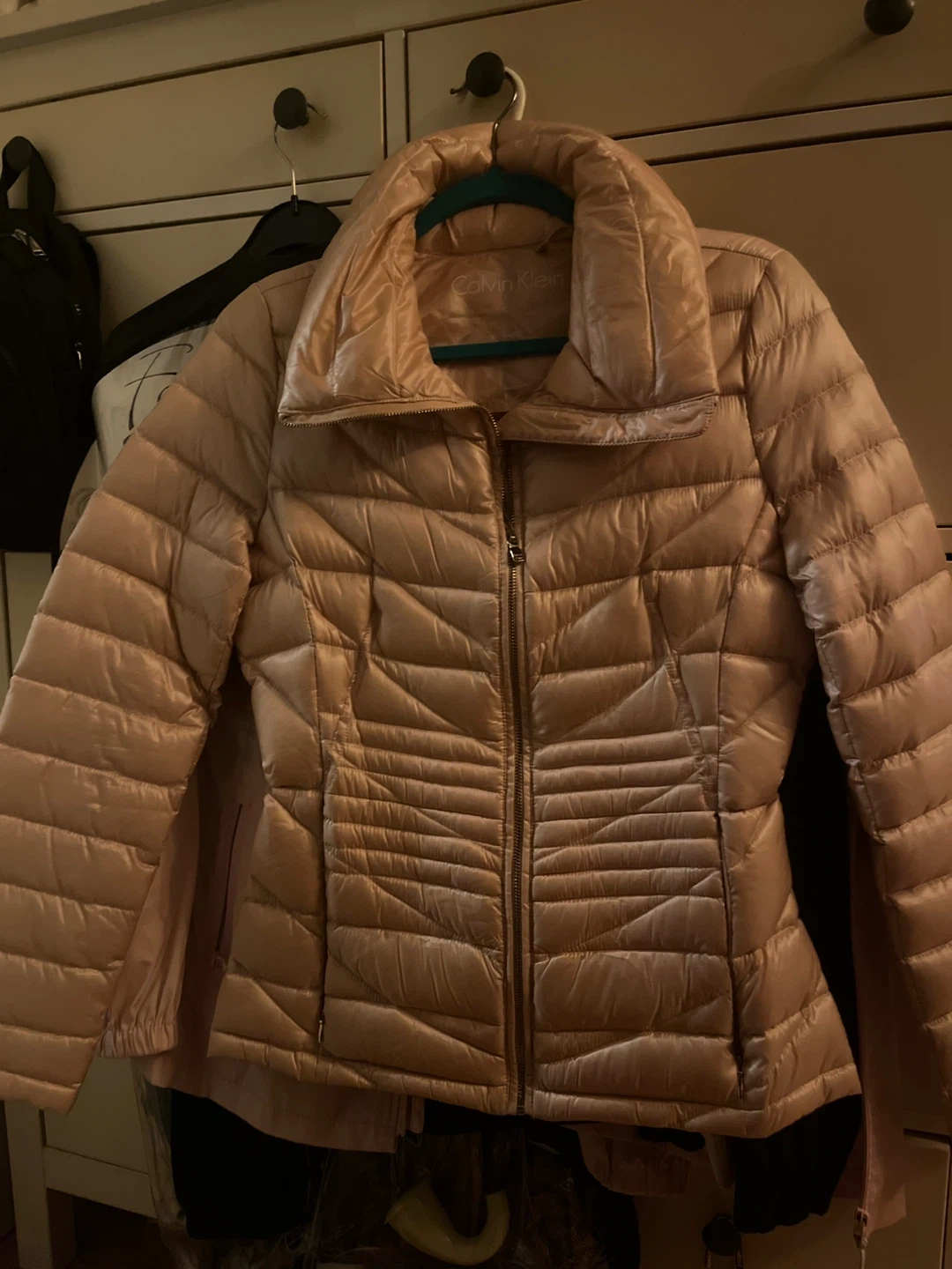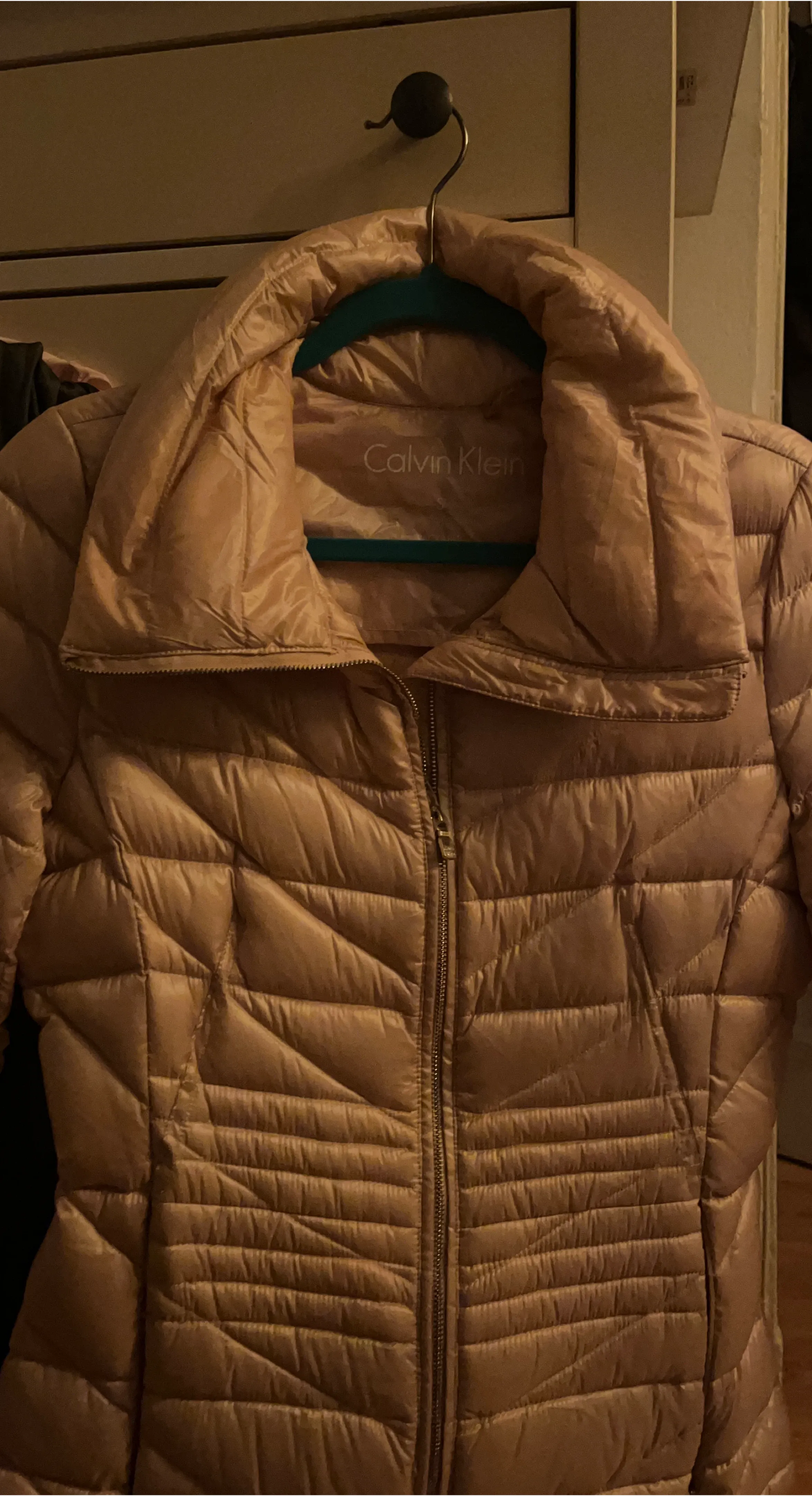 Selling a Calvin Klein puffer jacket in a beautiful light pink color! It's in great condition and perfect for staying warm and stylish. The jacket features a unique design with a peplum detail at the back.