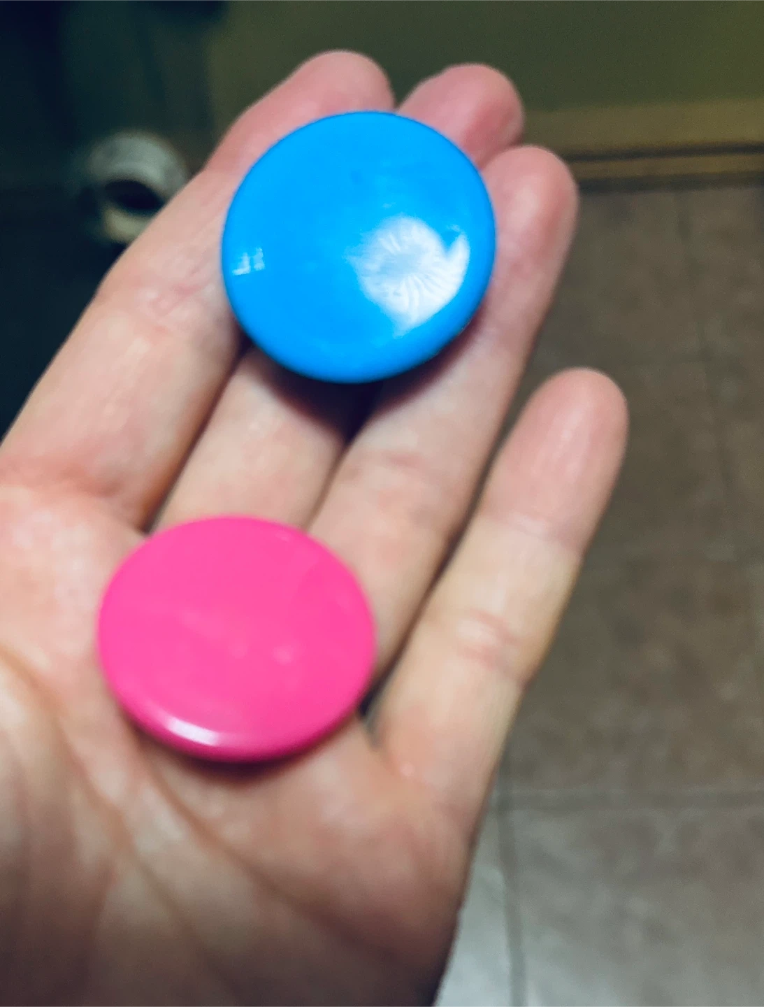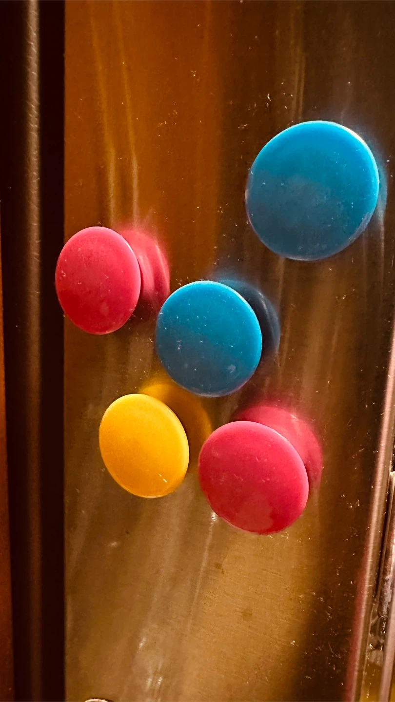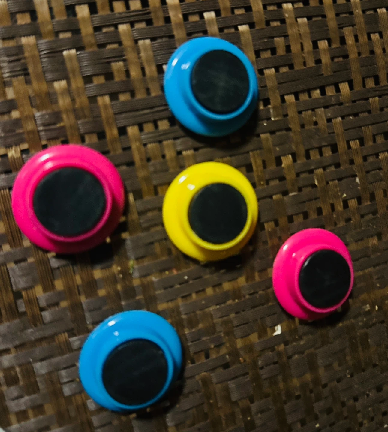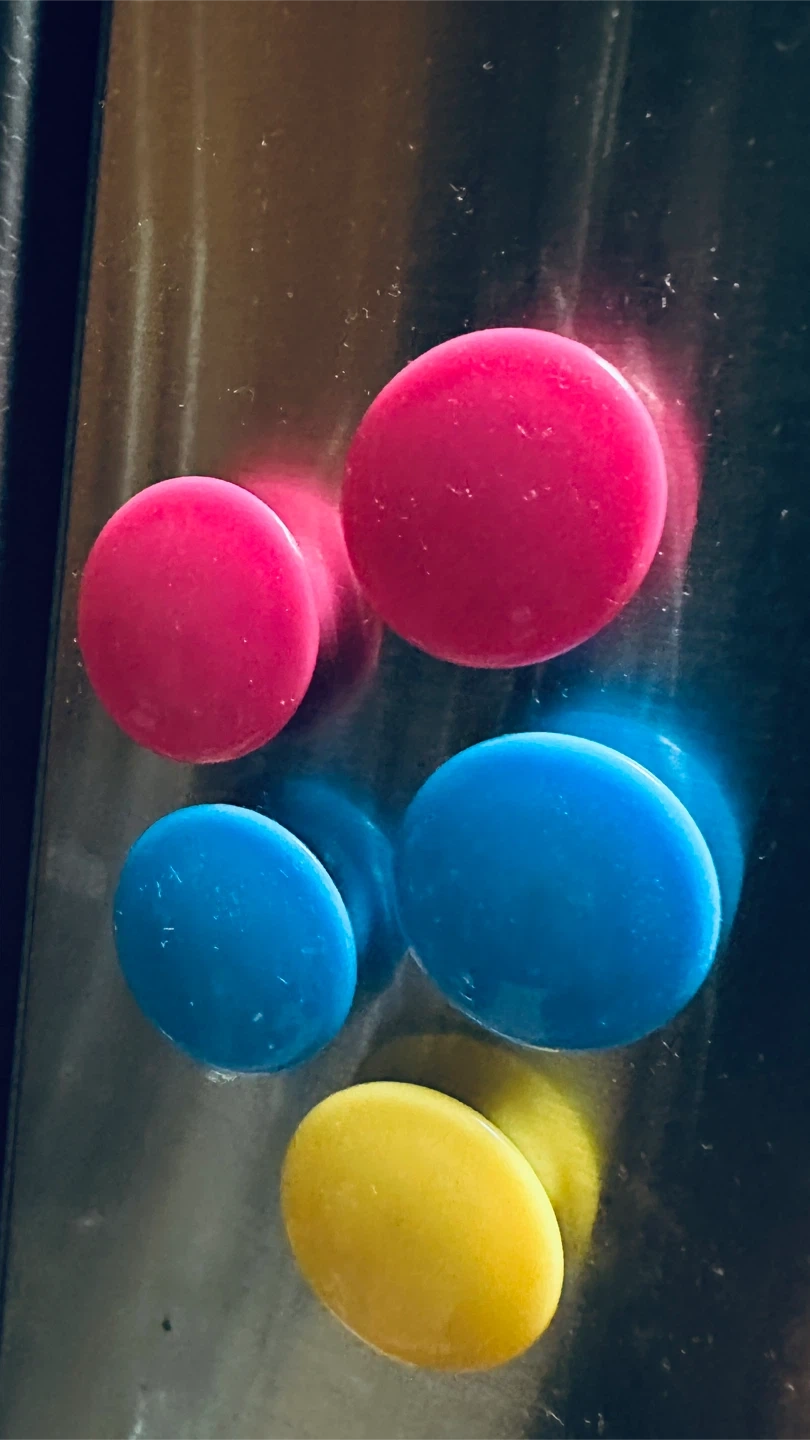 Selling a set of colorful round magnets! They come in pink, blue, and yellow. Perfect for adding a pop of color to your fridge or whiteboard
