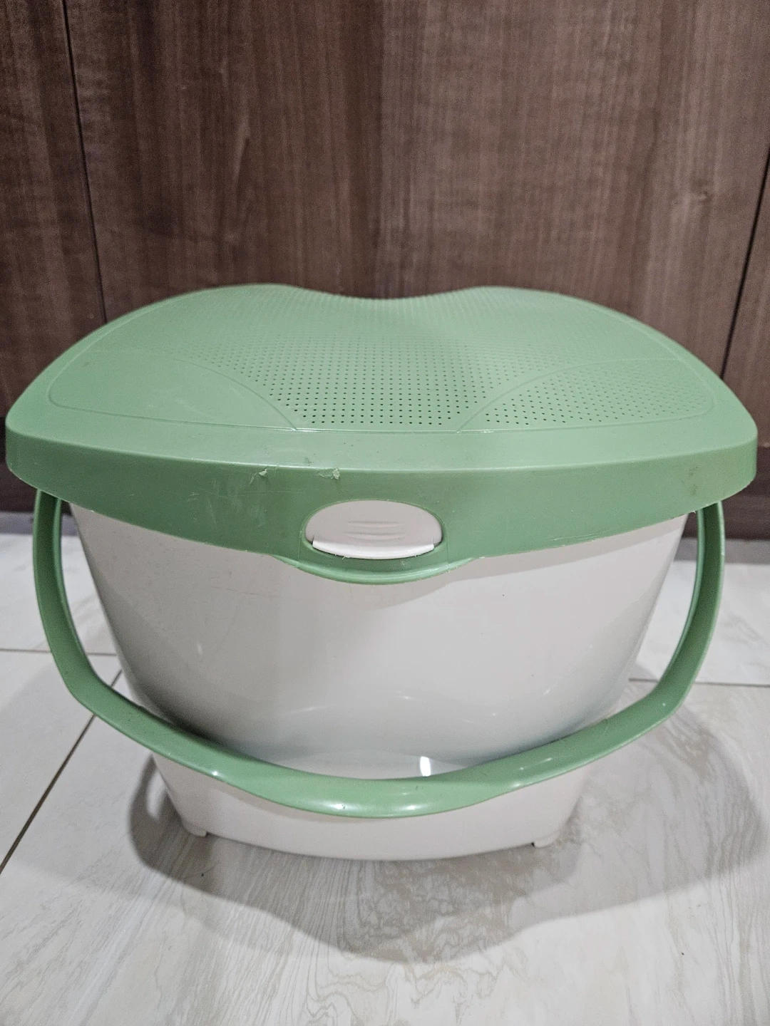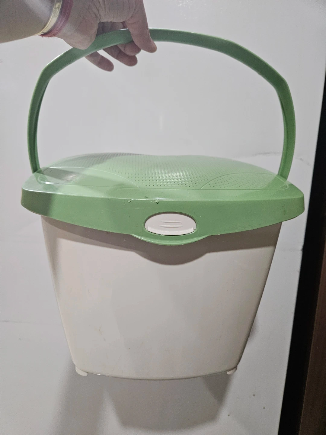 Selling a plastic bucket/ bin with a green lid and handle. The bucket itself is white. It's in good condition and ready for its next use!