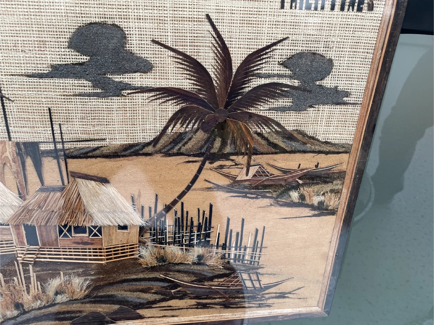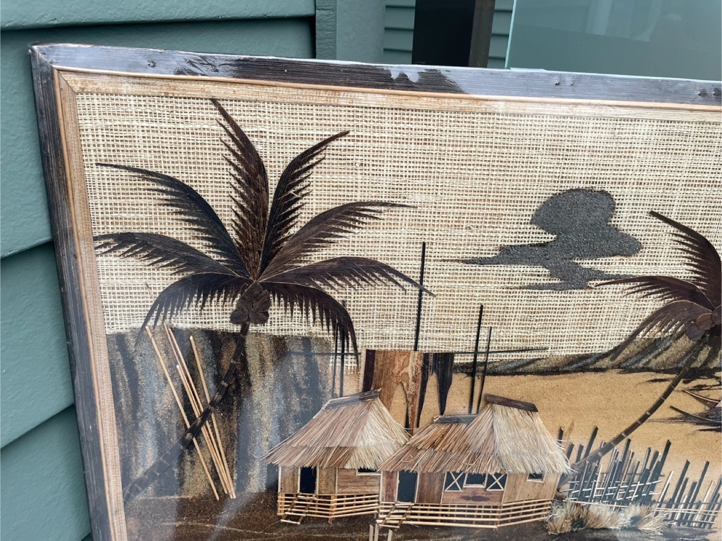 Beautiful handmade art from the Philippines, featuring houses and palm trees. It depicts typical rural life in the old days in the Philippines, houses made of NIPA HUT, paddle boats and fishnets made of dry bark. A unique piece for your home! 21” x 16”