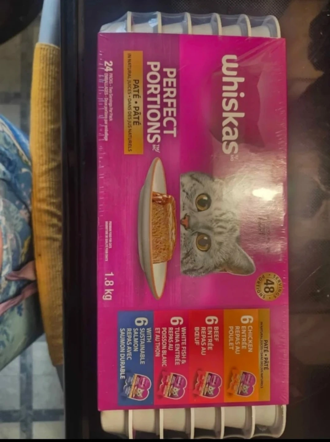 Selling a brand new pack of Whiskas Perfect Portions Pate wet cat food. This pack contains 24 individual servings, each with two portions, and is 1.8 kg in total. It includes a variety of flavours like chicken, beef, white fish & tuna and sustainable salmon in natural juices