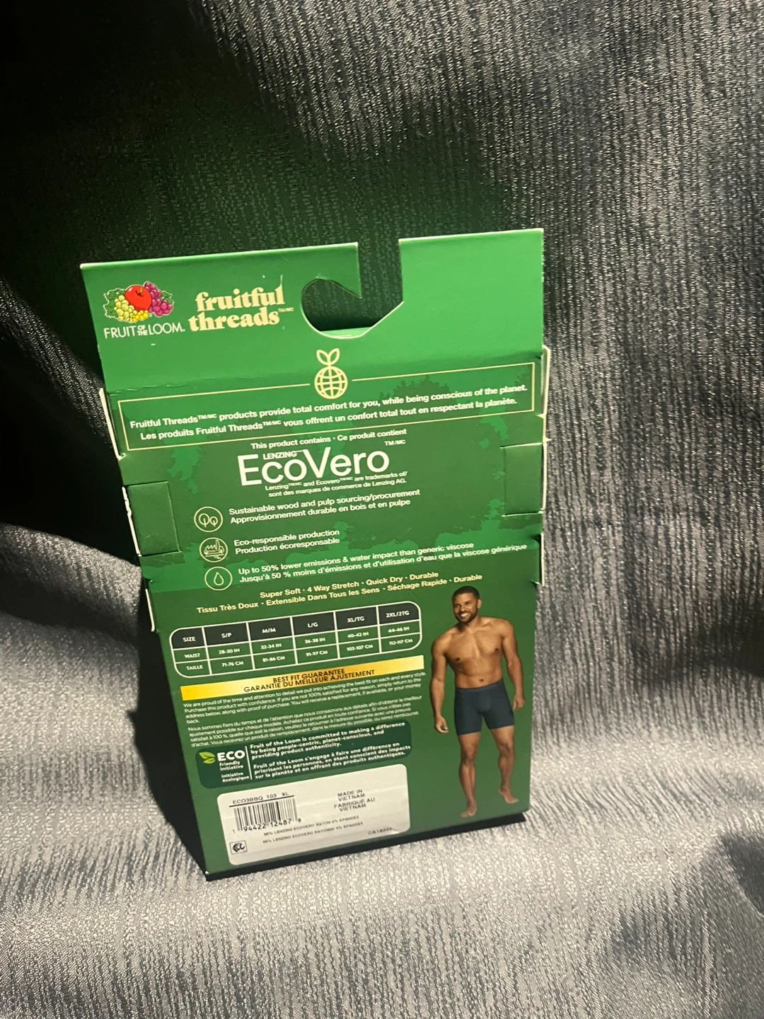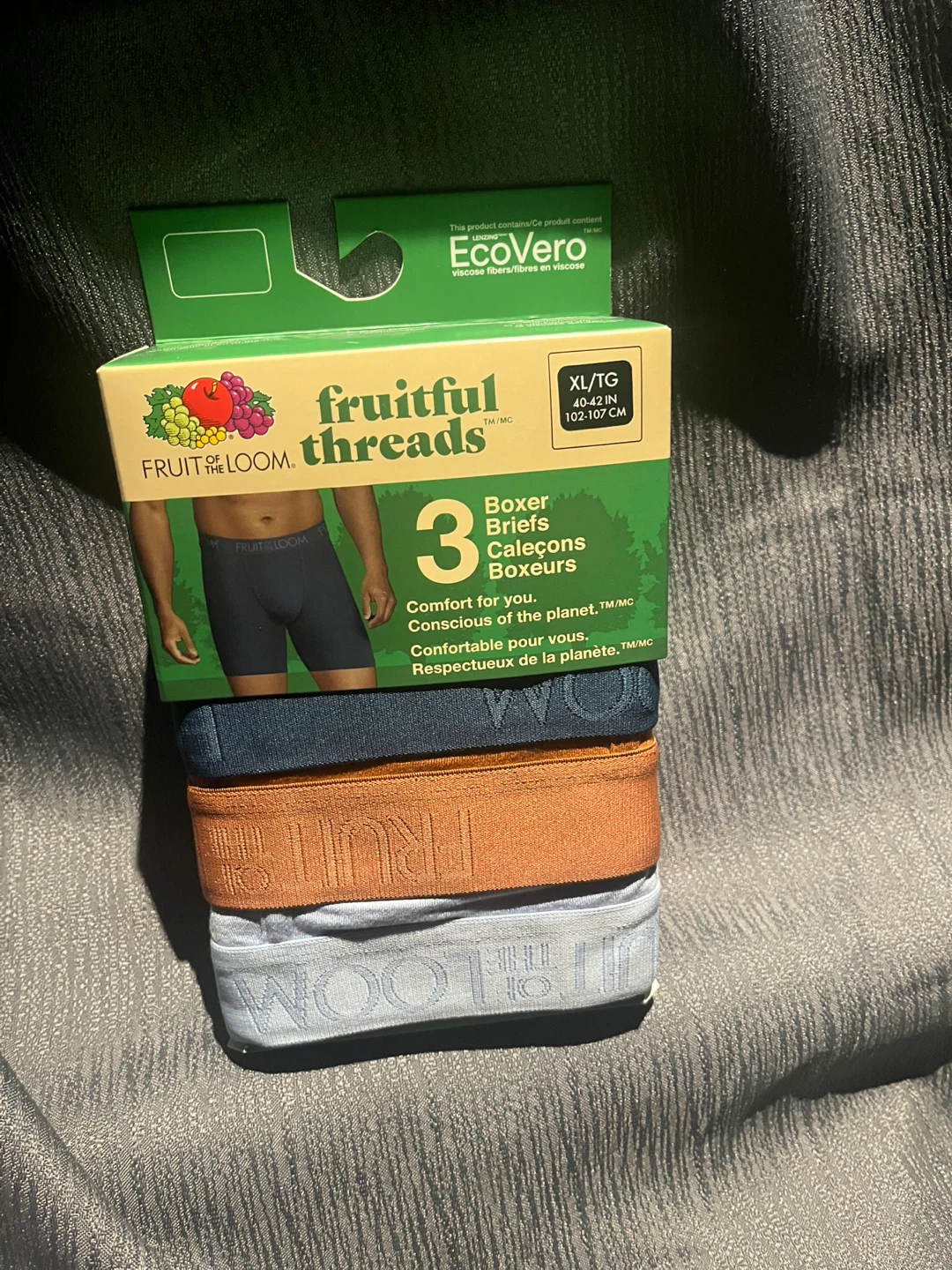 Brand new Fruit of the Loom boxer briefs, size XL. These are "Fruitful Threads" made with EcoVero viscose fibres. Comfort and sustainability in one!