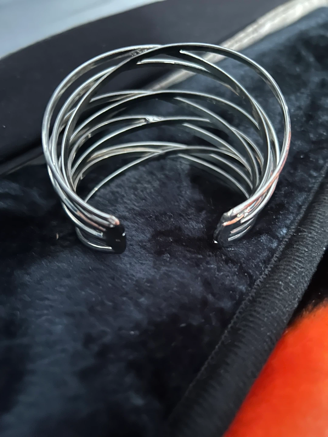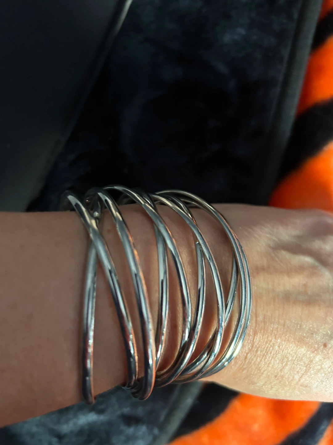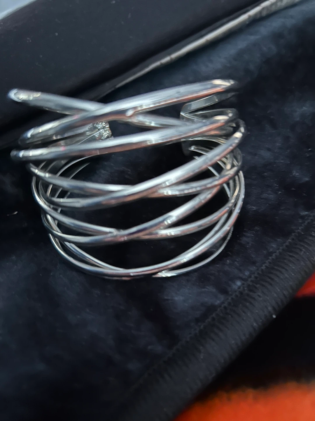 Here's a lovely silver-tone cuff bracelet! It features a stylish, multi-strand design that would add a touch of elegance to any outfit