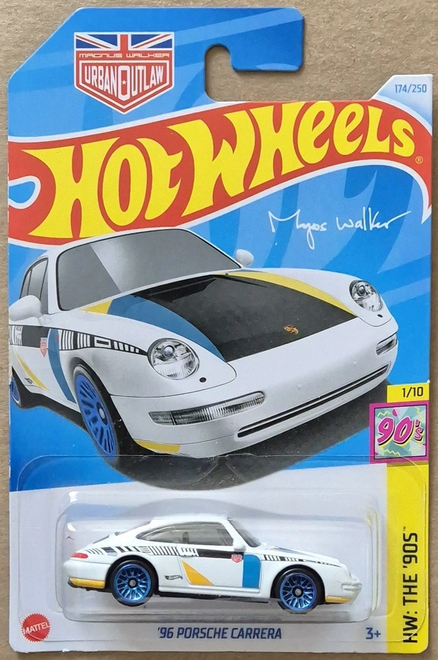 2024 Hot Wheels Mainline Series: HW: The '90s Colour: White Description: Blue, black, & yellow decals on sides, hood, & trunk, Hot Wheels logo & Magnus Walker Urban Outlaw logo on sides, "Carrera" on rear and Collection: