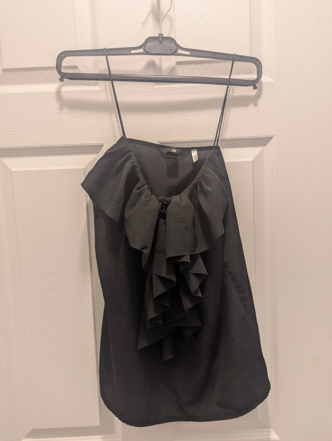 Selling a cute black tank top from H&M! It features a stylish ruffle design and is a size medium (US 6). Perfect for dressing up or down!