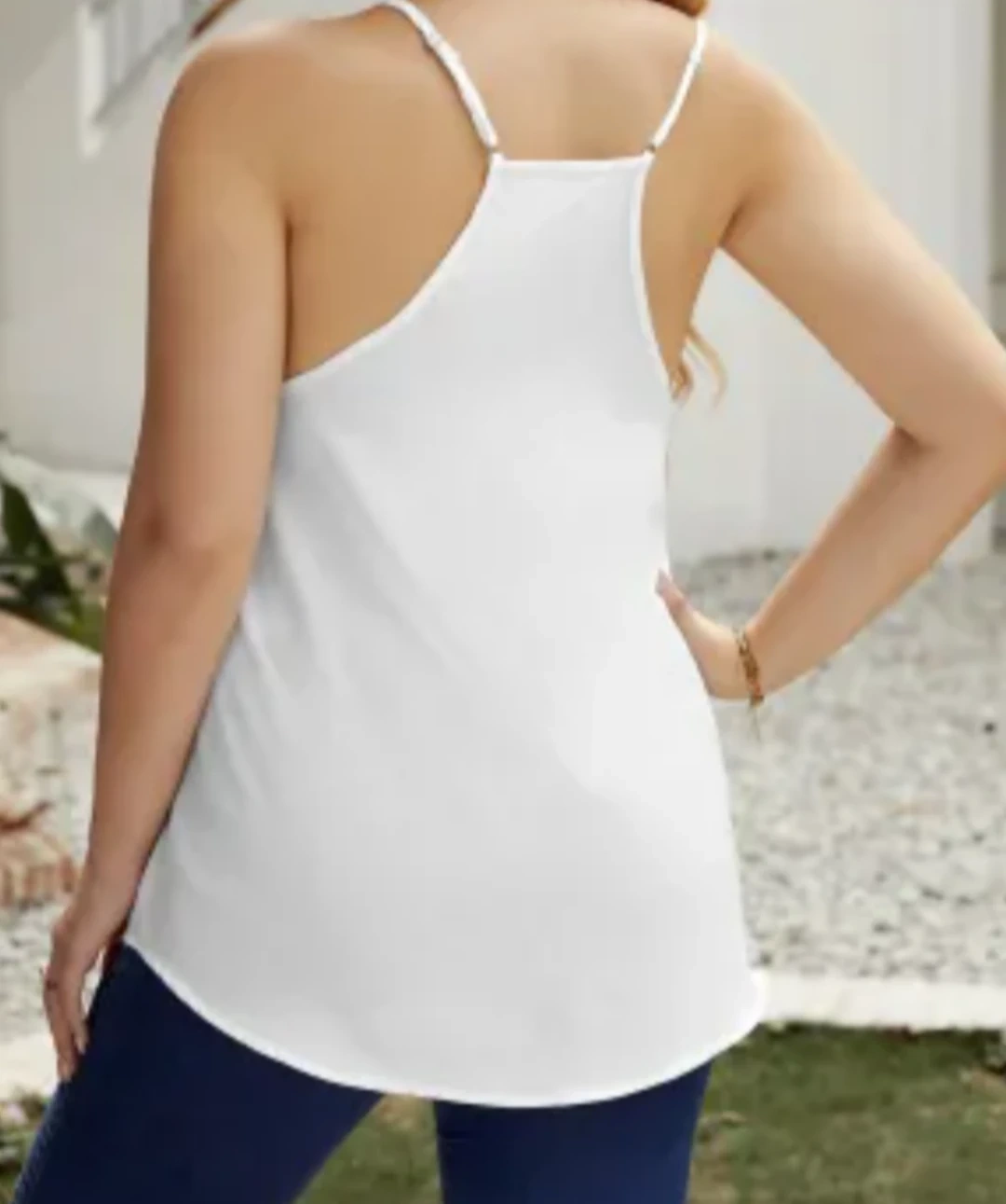 Here's a cute white spaghetti strap tank top! It's in great condition and ready for a new home. The top features a stylish design around the neckline, adding a touch of elegance to your casual wear. Perfect for layering or wearing on its own during warmer weather