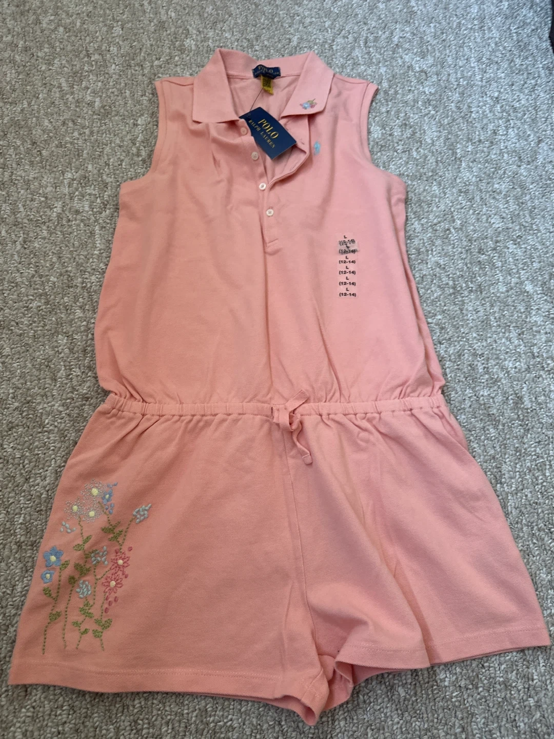 This is a brand new with tag Polo Ralph Lauren romper in size L (12-14). It's a really cute peach colour and has some lovely floral embroidery on the leg. Perfect for summer!