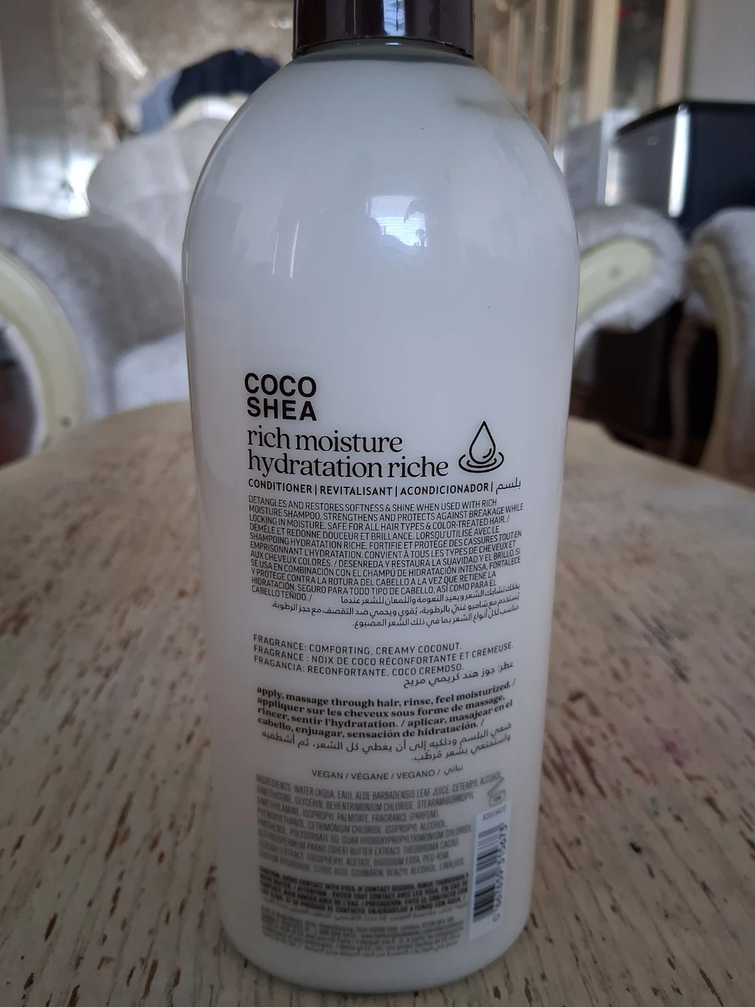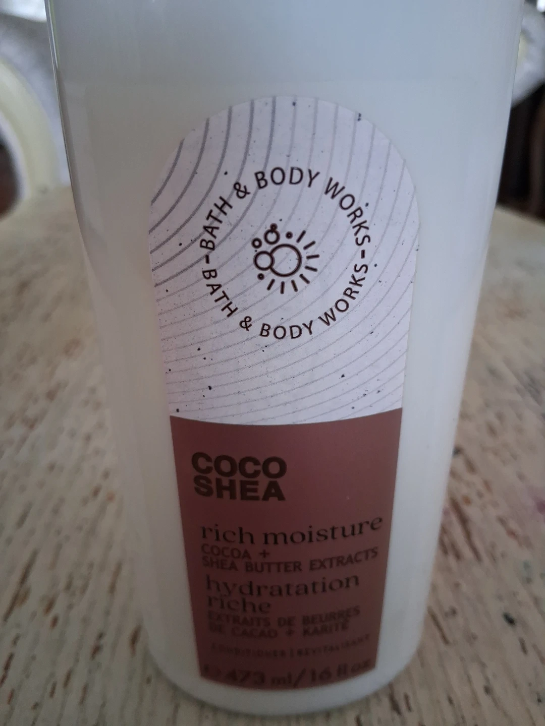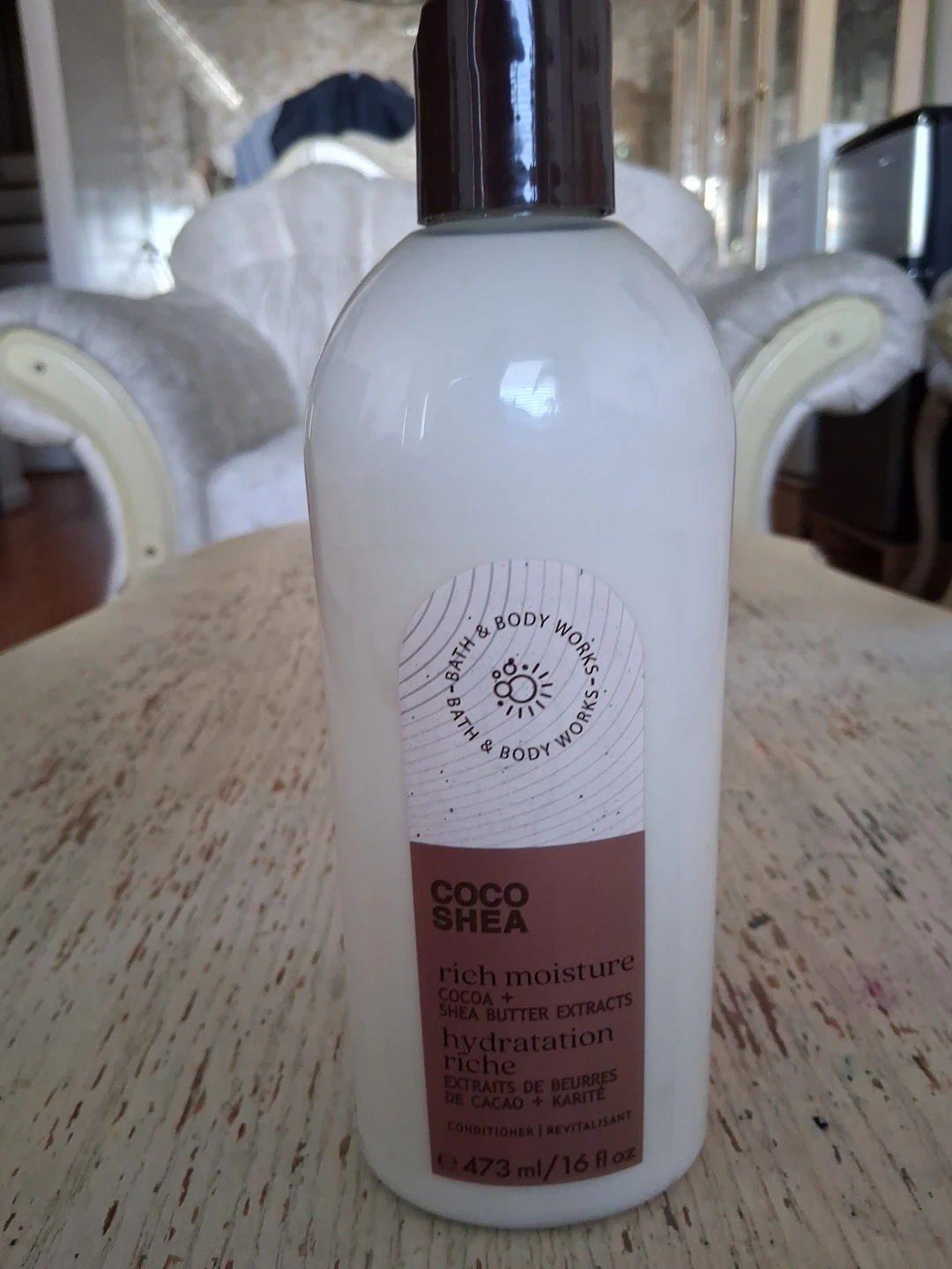 Bath & Body Works Coco Shea Rich Moisture Conditioner. It contains cocoa and shea butter extracts and is 473 mL / 16 fl oz. It is designed to revitalize and condition hair, leaving it soft and shiny. Brand new.