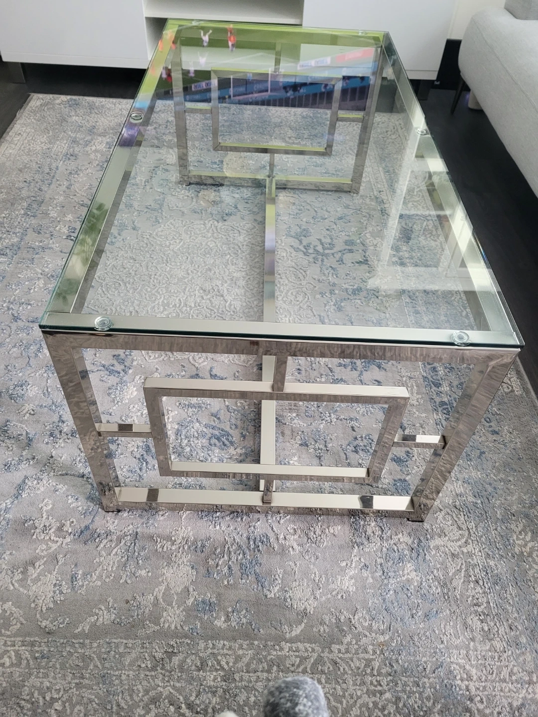 Selling a coffee table with a glass top and a chrome frame. It's in great condition and would look great in any living room! The design is modern and stylish, perfect for adding a touch of elegance to your space