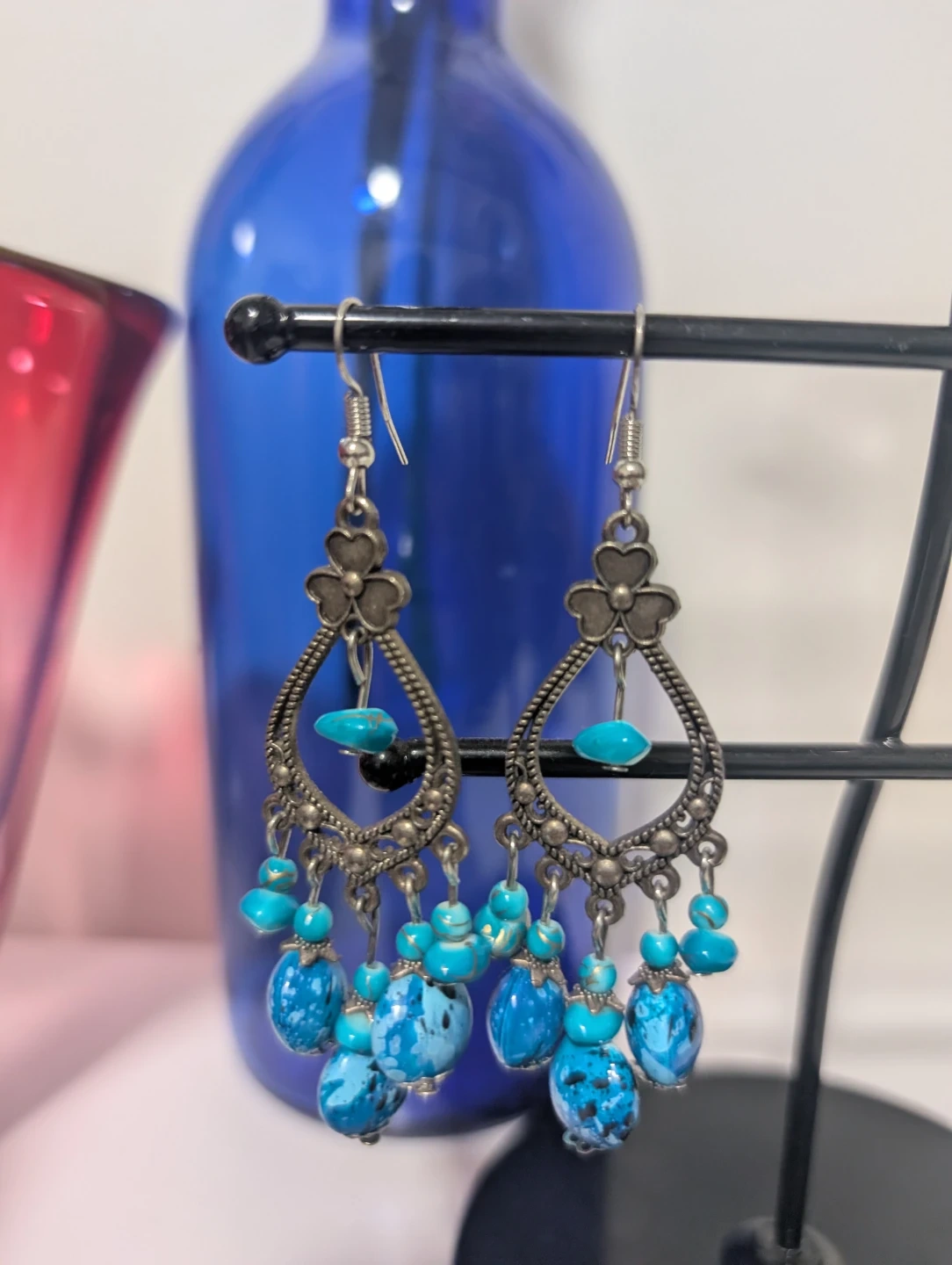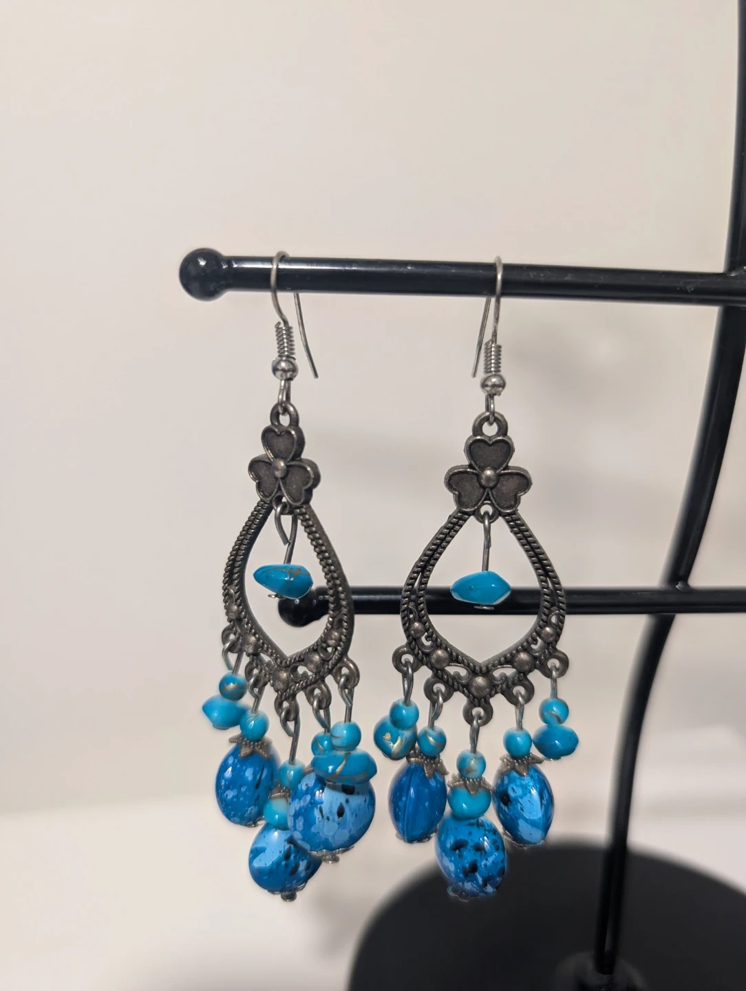 These are a pair of beautiful dangle earrings with a turquoise bead design. They're perfect for adding a pop of colour to any outfit! The earrings feature a silver-tone metal and are in great condition.