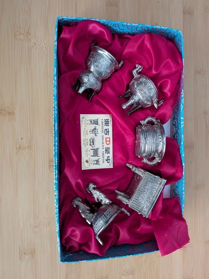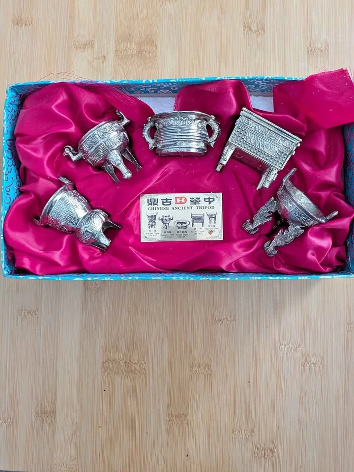 These miniature tripod vessels, inspired by the ancient Chinese ding (鼎), beautifully capture the traditional form of these iconic ritual objects. In Chinese history, dings symbolized authority, reverence, and ancestral honor, often used in ceremonies and offerings. This vintage set of five copper metal replicas showcases classic shapes and decorative details, making them ideal for collectors of Asian art, décor enthusiasts, or those interested in cultural symbolism.