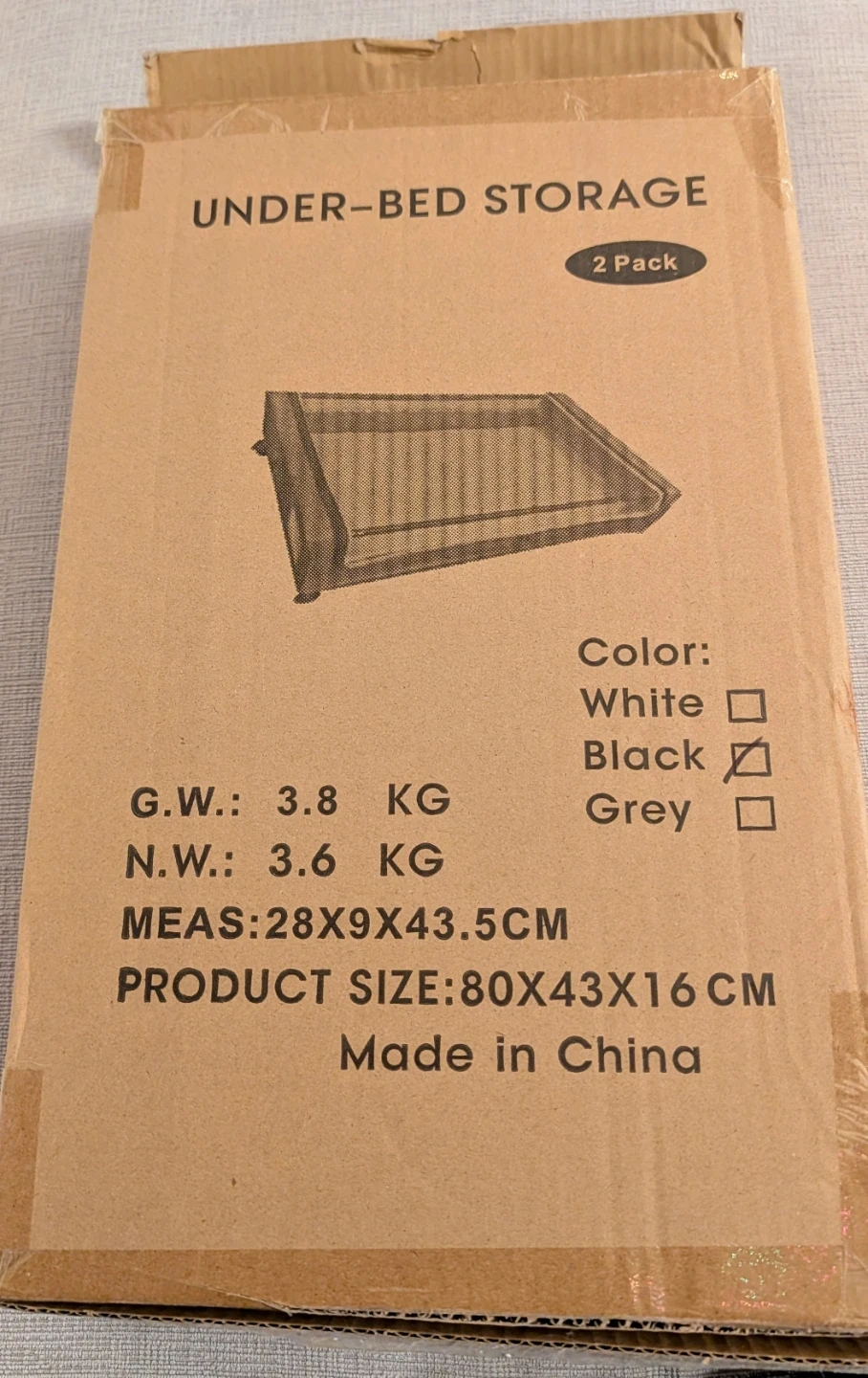 Selling a new, in-box 2-pack of under-bed storage containers. The box indicates the colour is black.