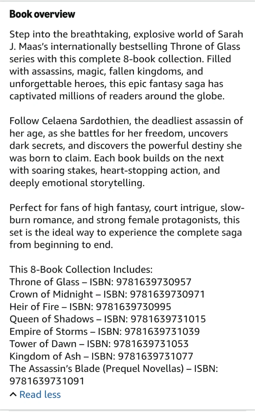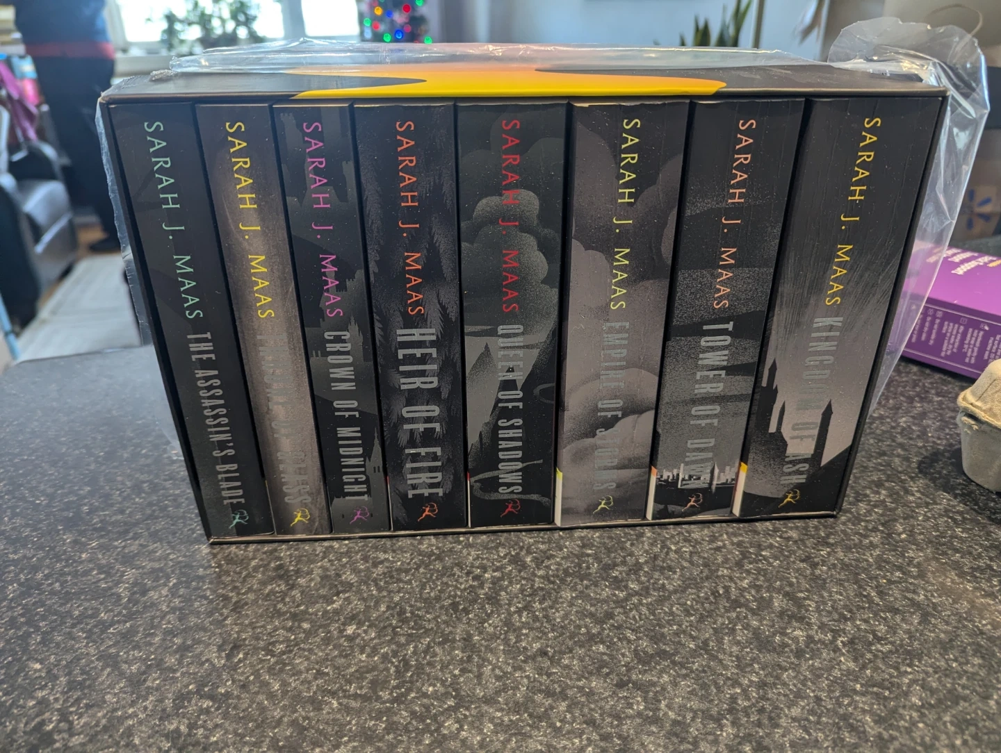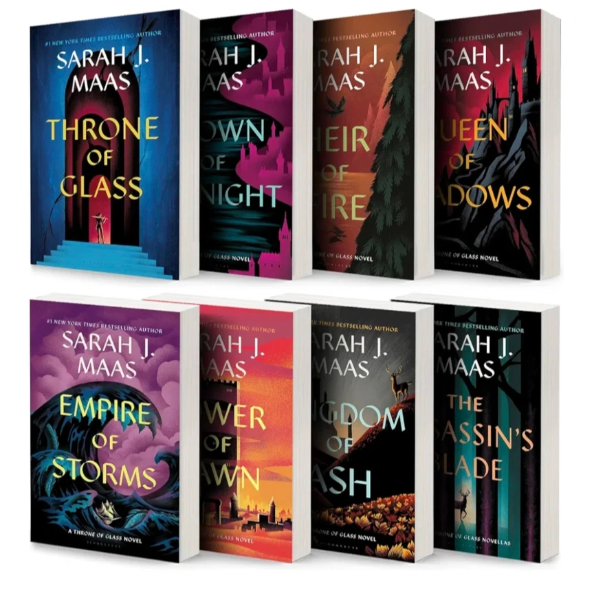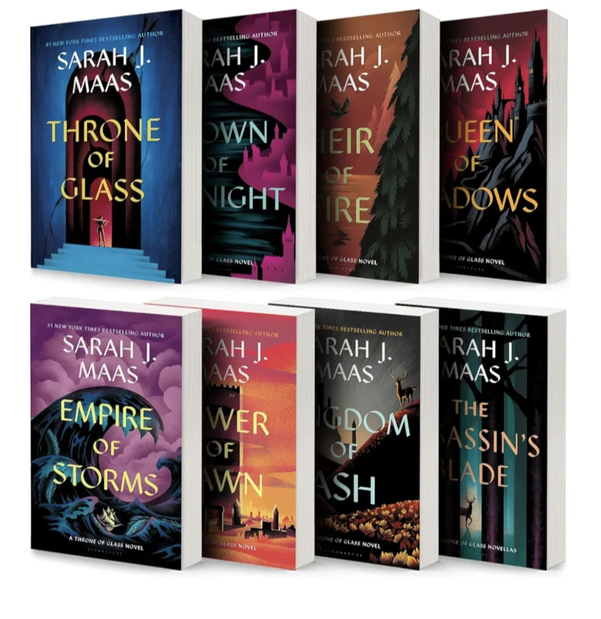 Titles include: Throne of Glass –Crown of Midnight -- Heir of Fire – Queen of Shadows –Empire of Storms – Tower of Dawn – Kingdom of Ash – The Assassin’s Blade (Prequel Novellas)
