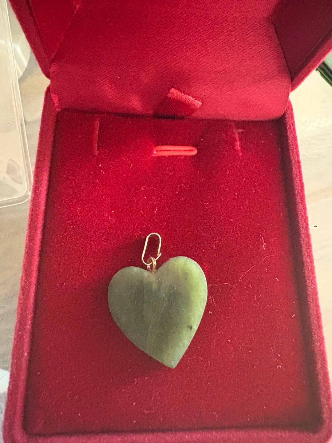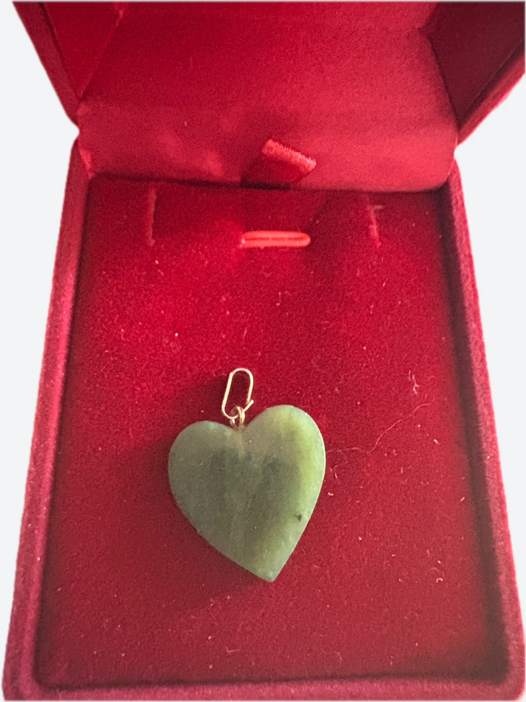Here's a lovely jade heart pendant! It comes in a red box, perfect for gifting or keeping it safe. The jade has a beautiful, natural green colour. It would make a wonderful addition to any jewellery collection