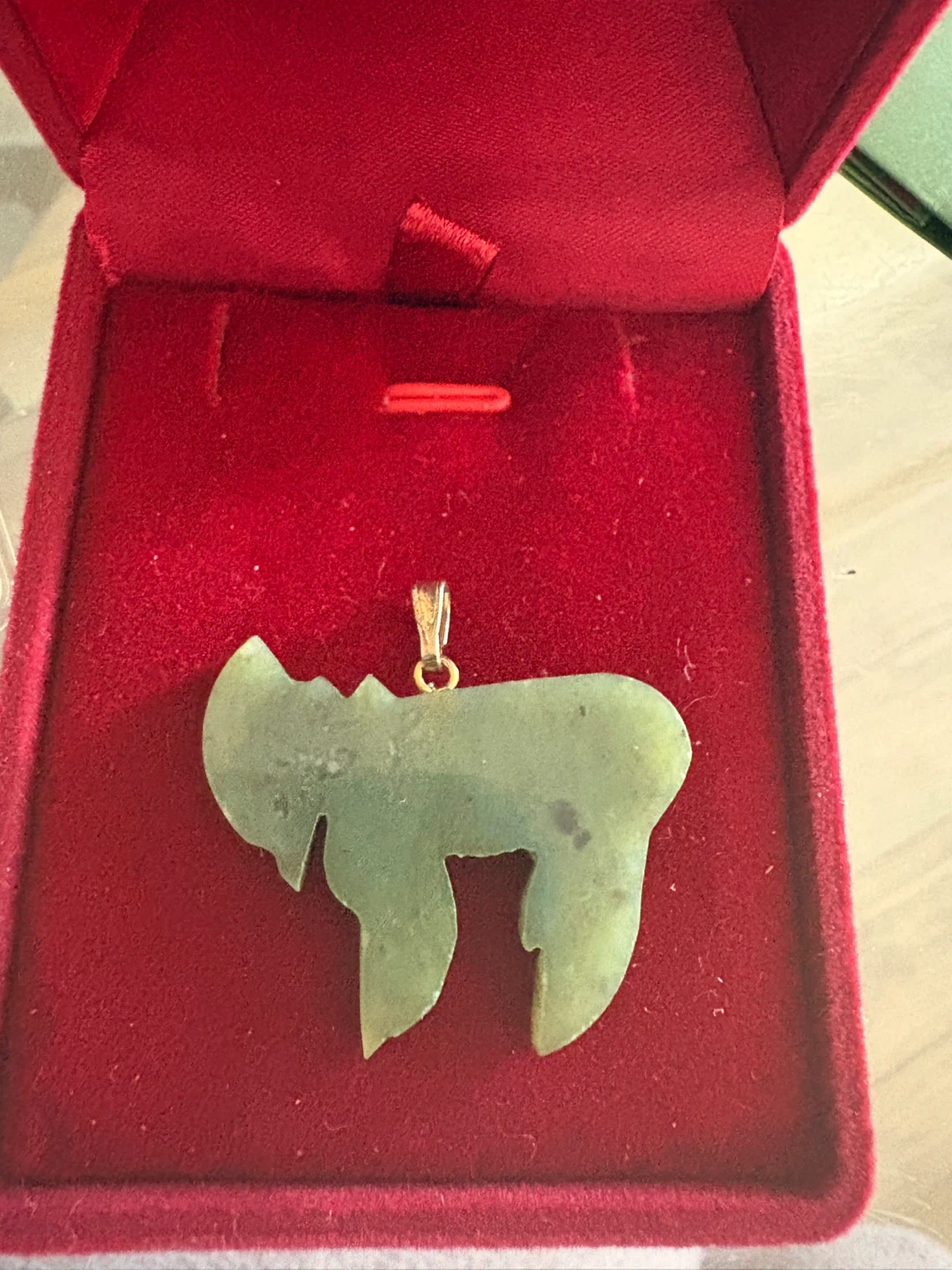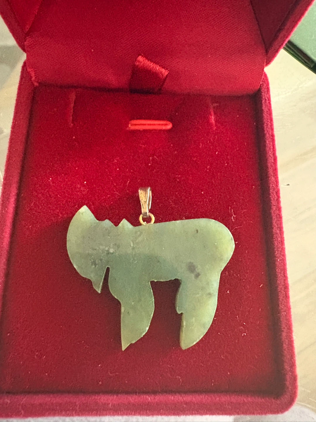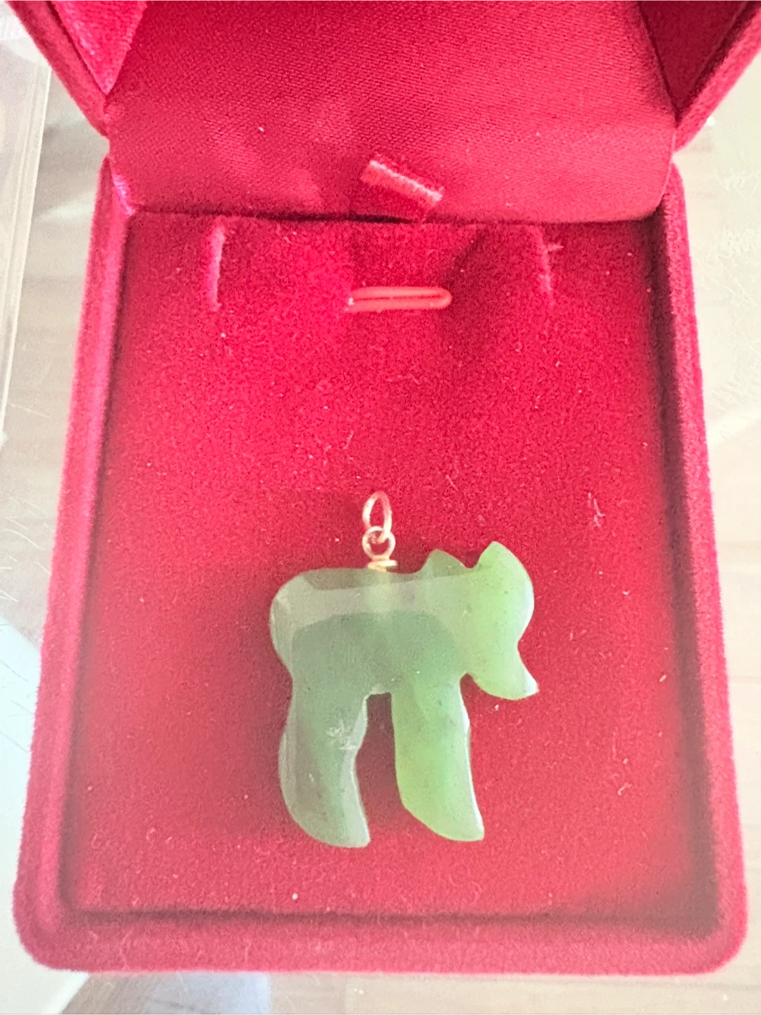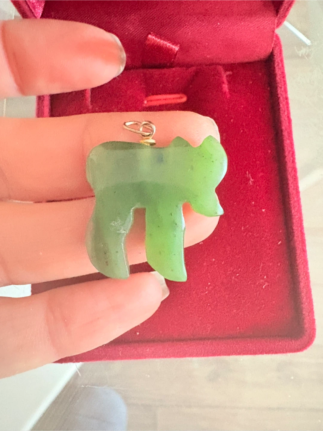 Selling a 14k real jade lovely green jade Chai pendant. It comes in a red box, perfect for gifting or keeping it safe. A beautiful piece to add to your collection!