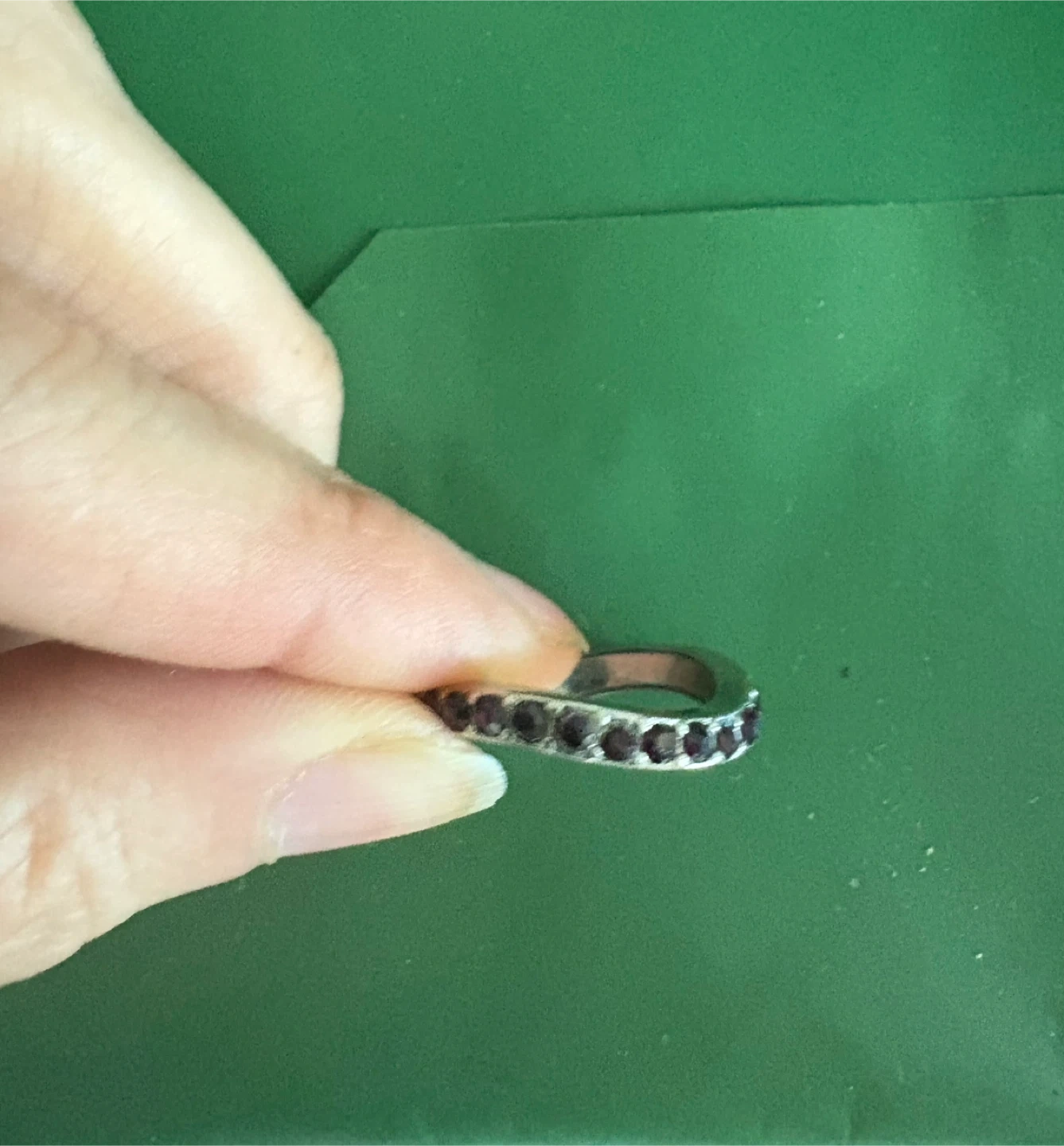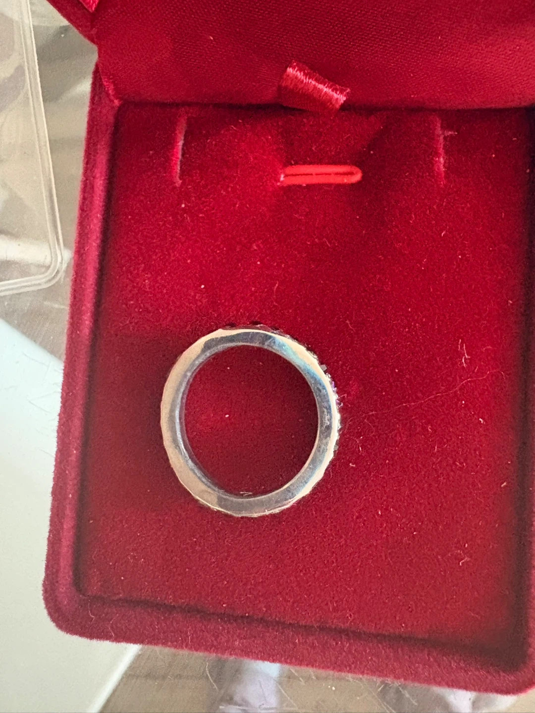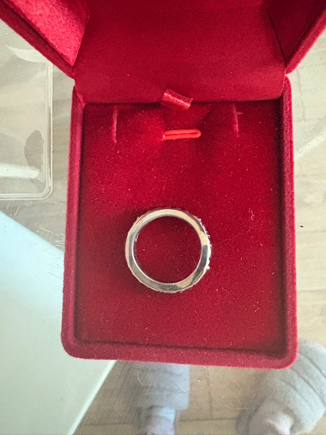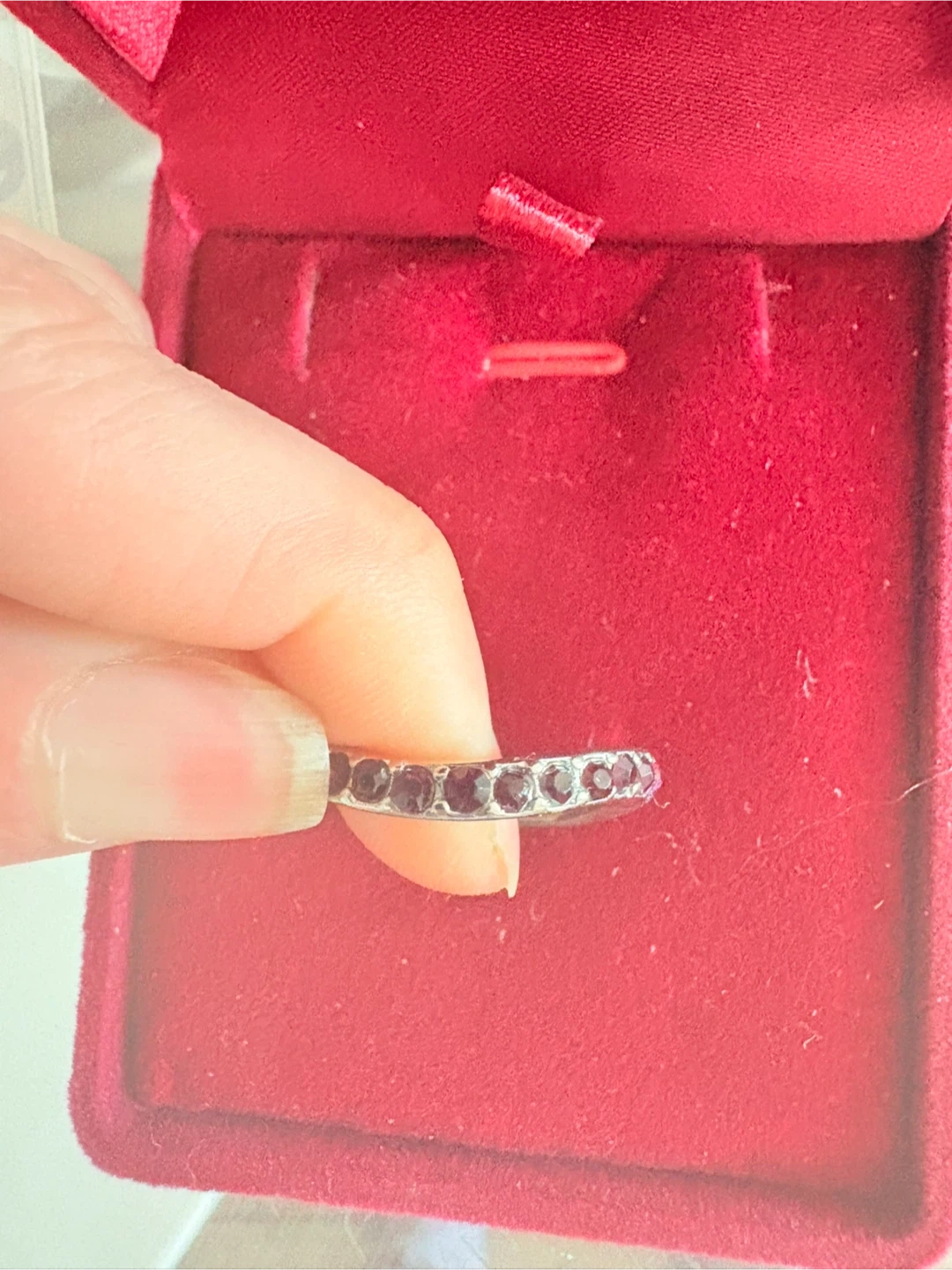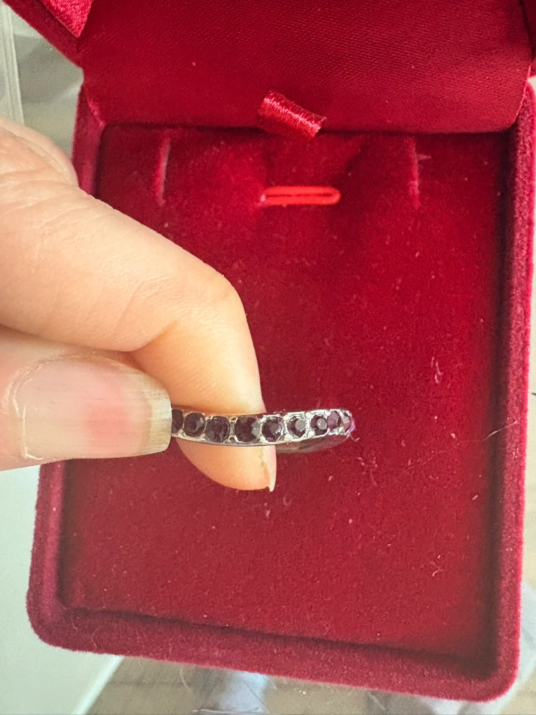 Selling a beautiful 14k plated eternity ring! It features small, round red stones set all the way around the band. It's in great condition and comes in a red box, perfect for gifting or keeping it safe.