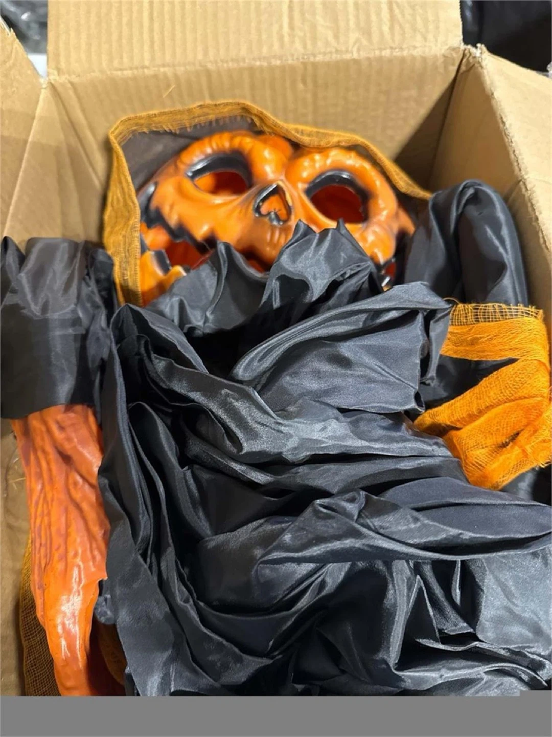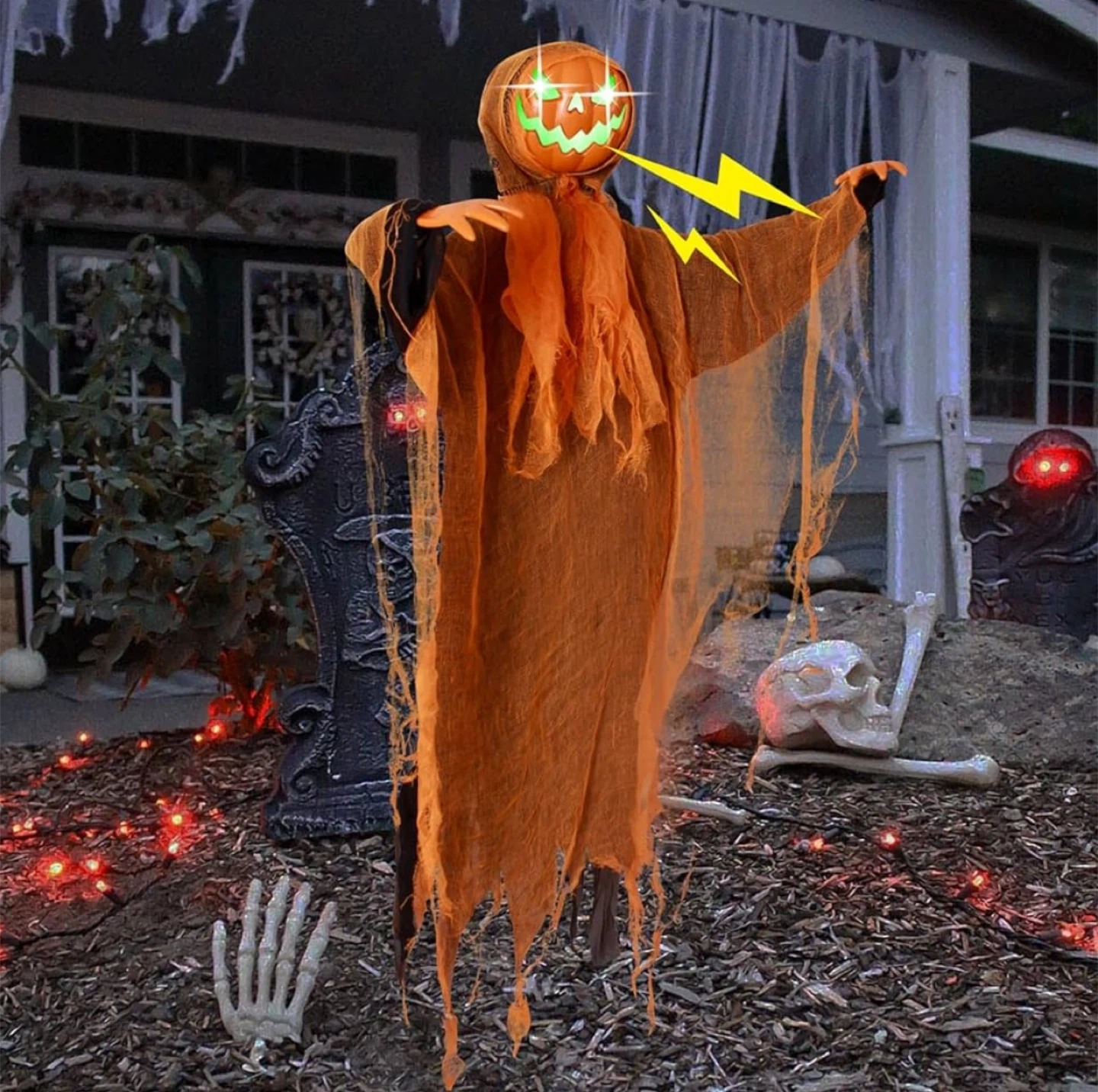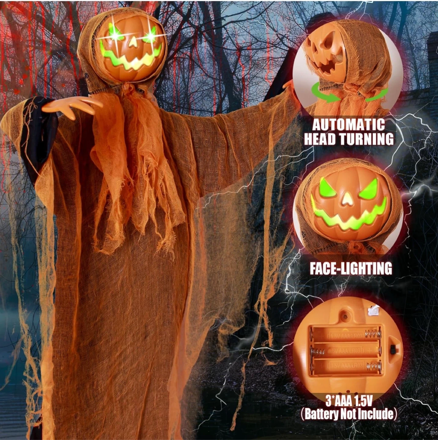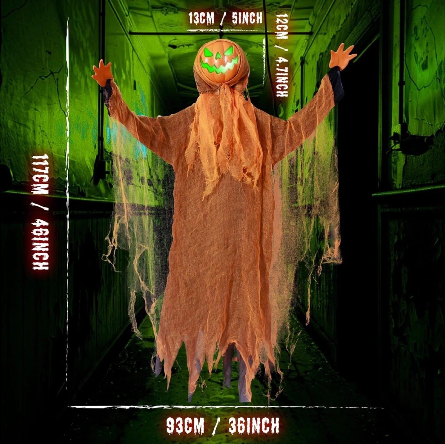43" Hanging Ghost Pumpkin Man Grim Reaper, Glowing Rotating Pumpkin Head with Creepy Voice/ Bendable Arms for Indoor/Outdoor Halloween Yard, Graveyard, Haunted House