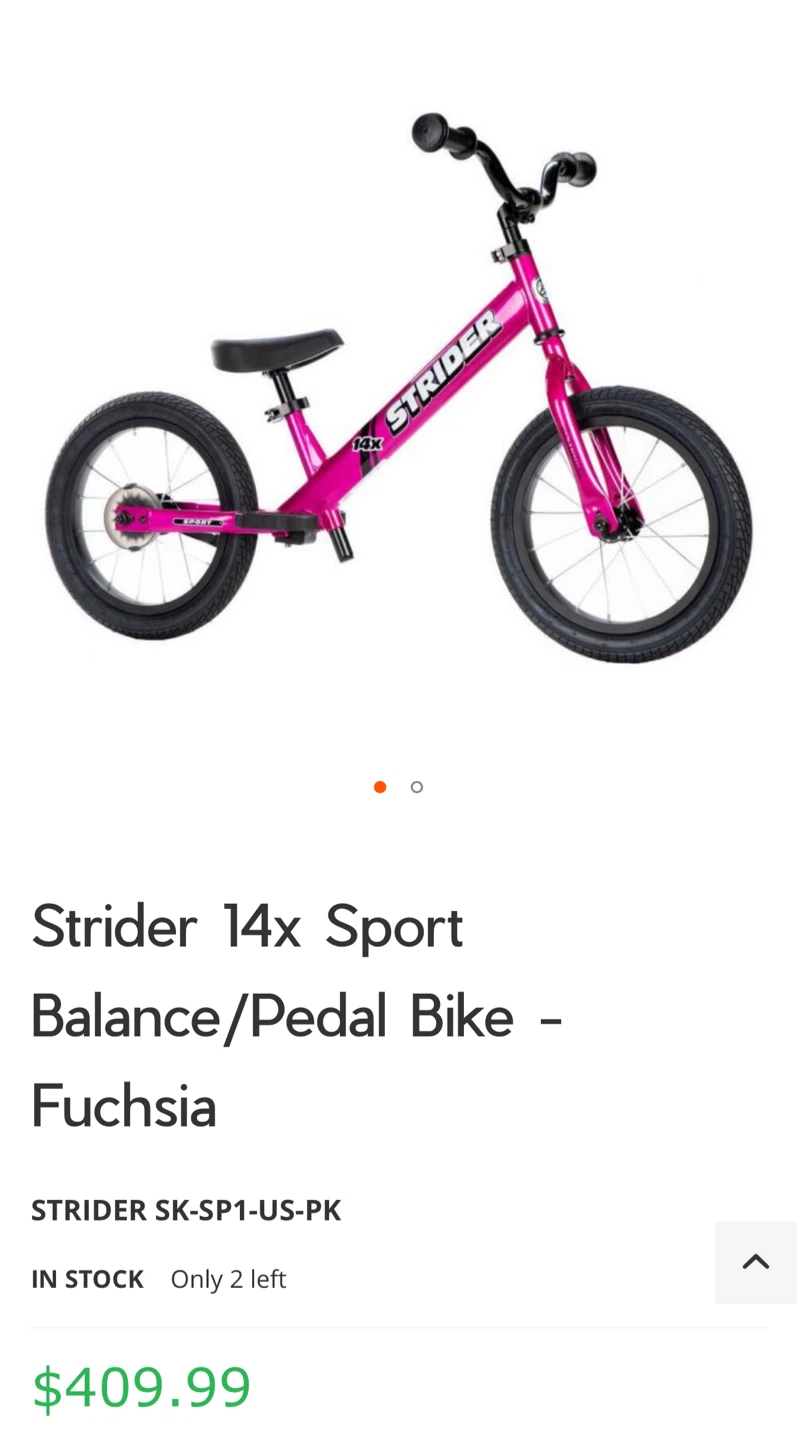 1 / 41 / 4Buy & SellStrider 14x Sport Balance/Pedal Bike - FuchsiaStrider 14x Sport Balance/Pedal Bike - Fuchsia$180Selling a Strider 14x Sport Balance/Pedal Bike in Fuchsia! It's in great condition and ready for a new rider. Originally bought for $409.99.ConditionGoodWHERE TO MEETCheck LocationView MapSELLERverifiedDonMetrotown1165 reviews0 chats·0 favorites·9 viewsSEND CHAT TO SELLERHi Don! I’m interested in your listing.Hi Don! I’m interested in your listing.Get the Karrot app to chatSign In to chat