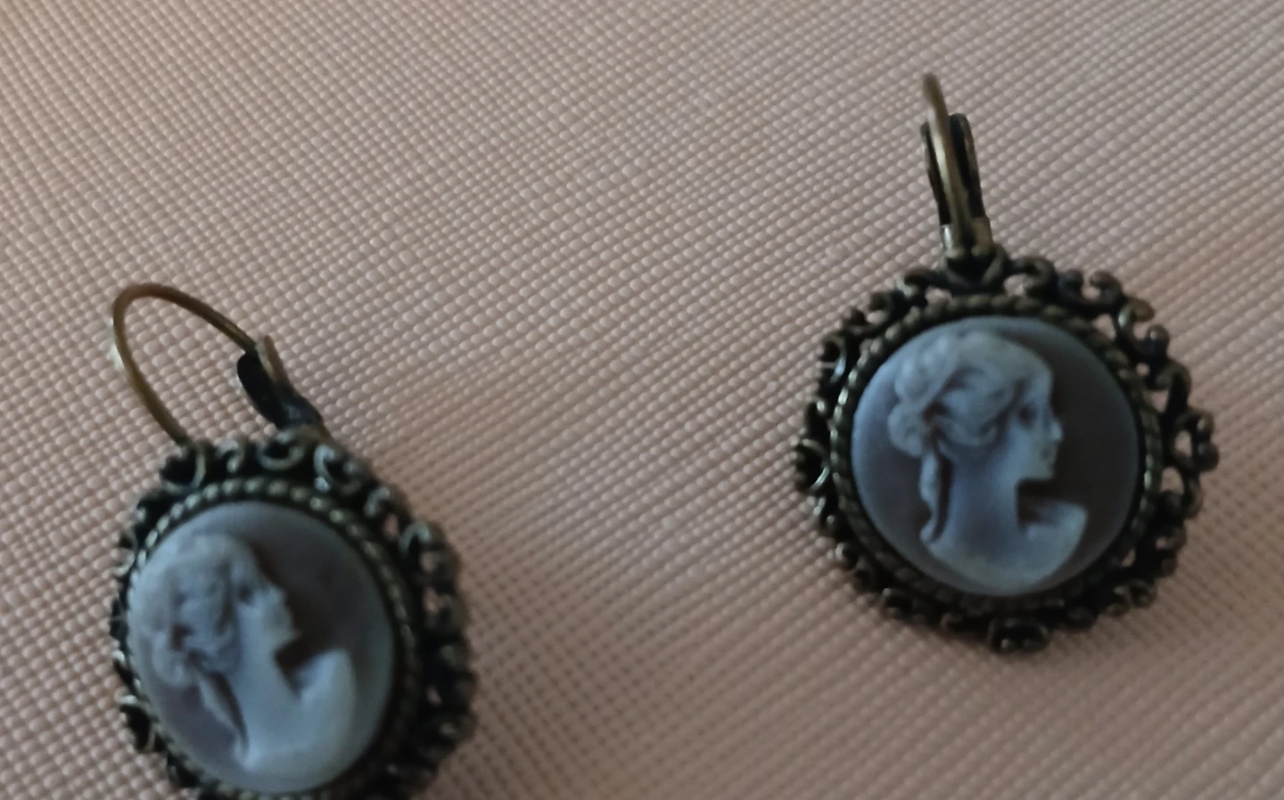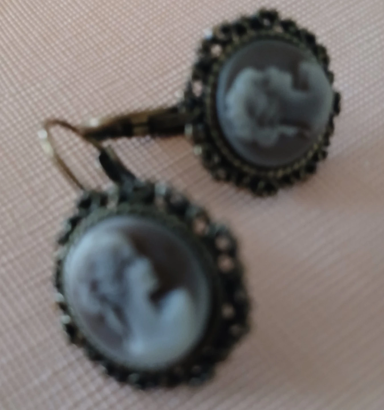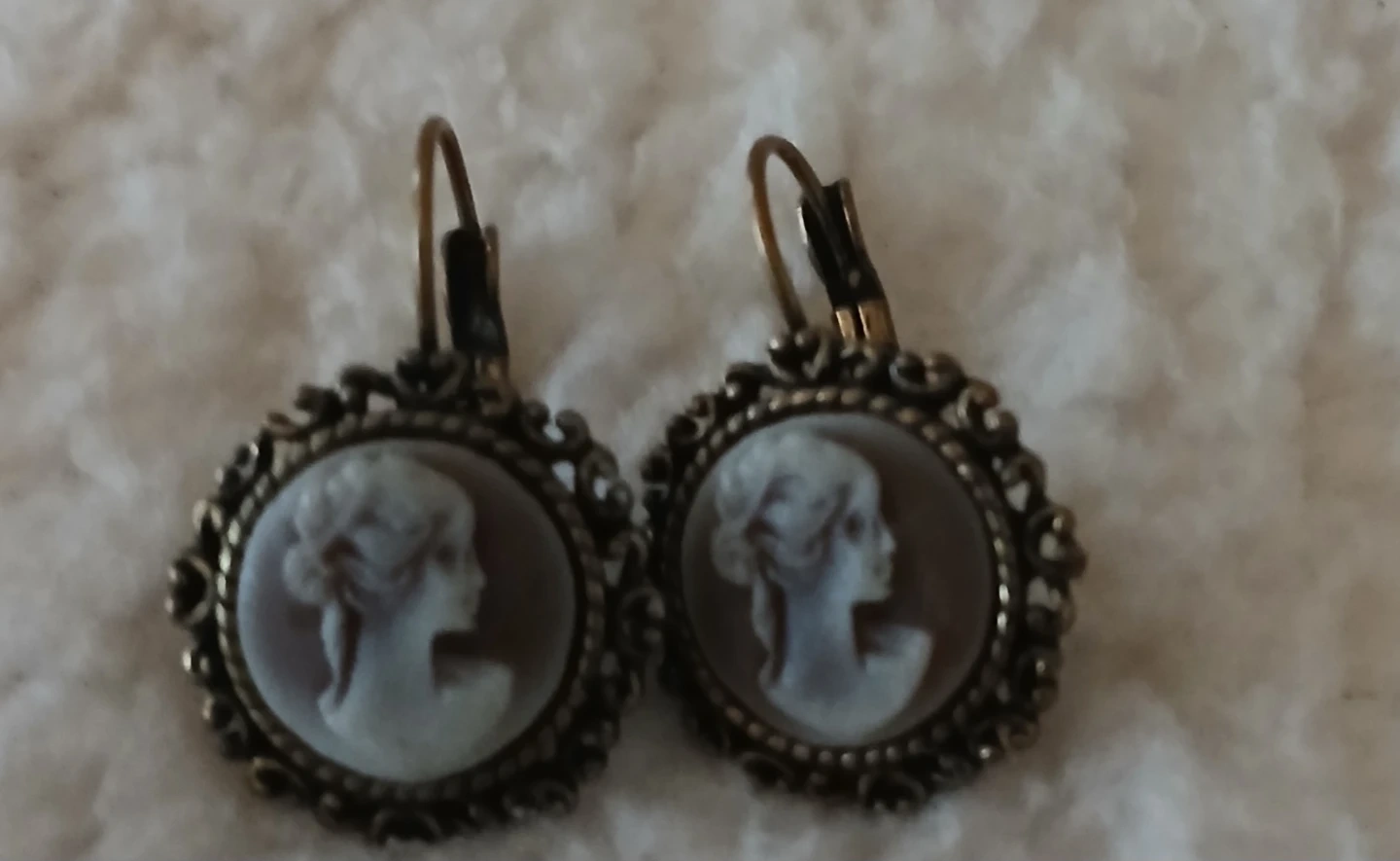 Cute cameo earrings that are vintage. They feature a classic cameo design with an ornate border. Perfect for adding a touch of elegance to any outfit!