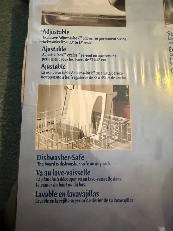 It is designed to fit sinks ranging from 13" to 17" wide. The board is adjustable and features non-skid components. The design allows for washing and draining items directly over the sink, saving counter space. It is made from durable, BPA-free plastic.