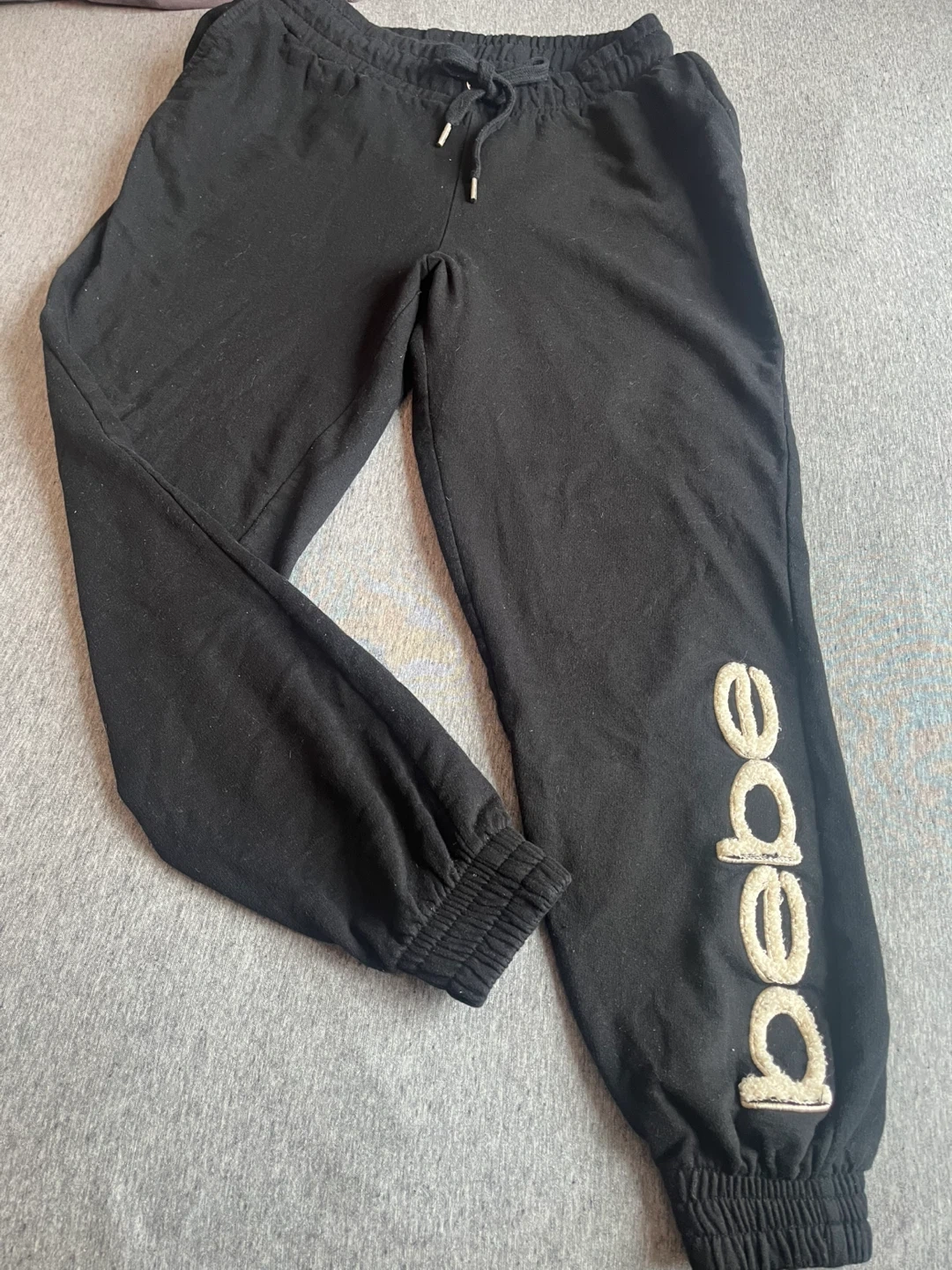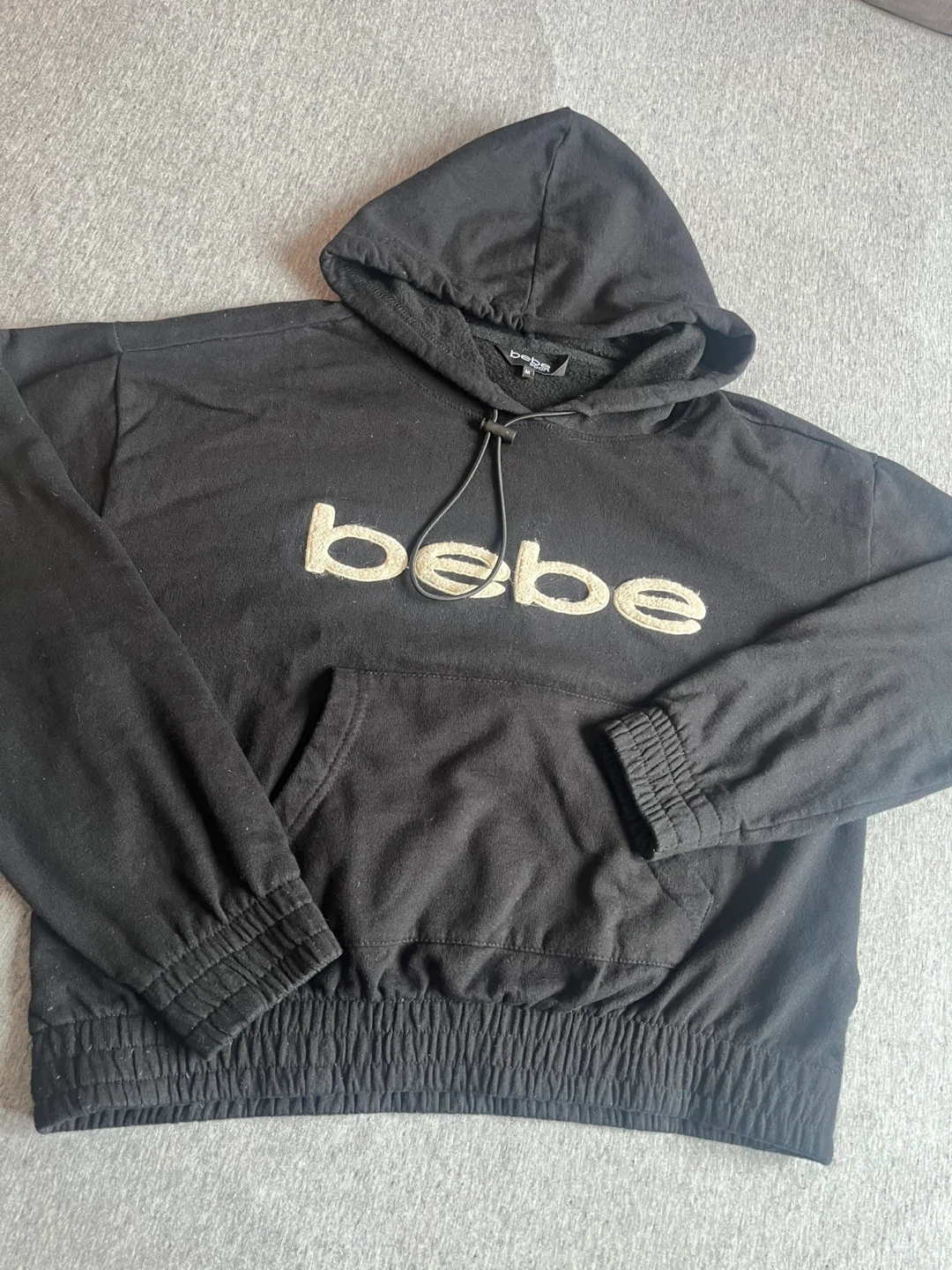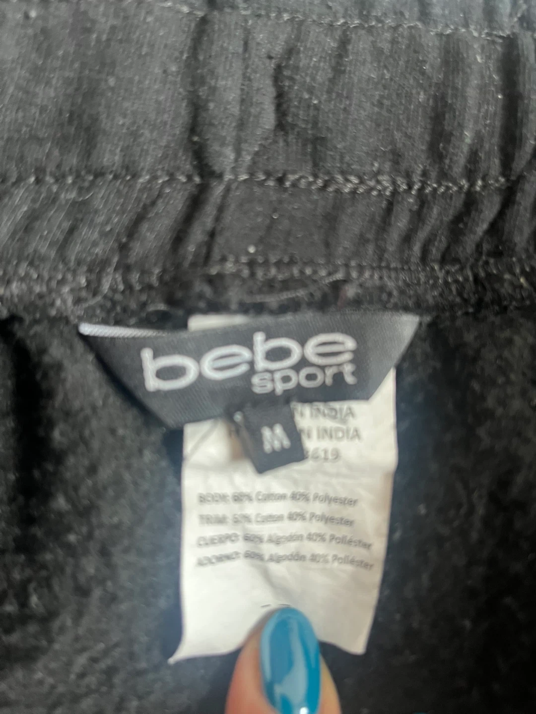 Black Bebe Sport hoodie and matching jogger set. Set is size medium. Hoodie has a front pocket and drawstring hood. Joggers have an elastic waistband with drawstring and pockets
