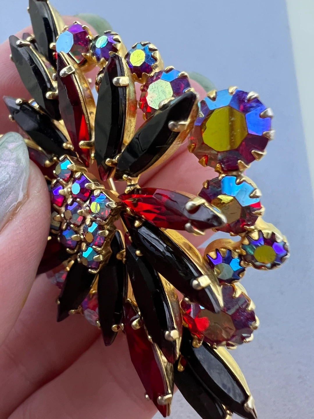 Beautiful starburst pattern with multifaceted red and iridescent rhinestones