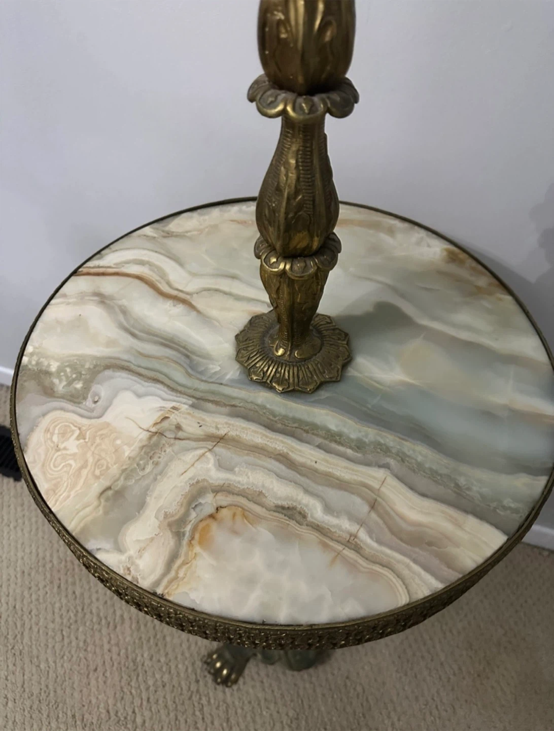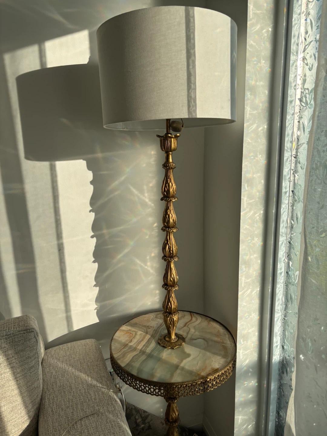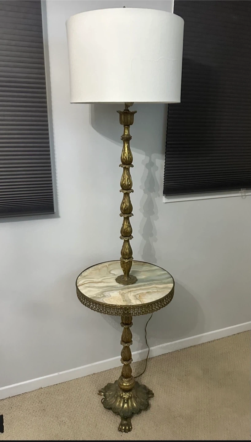 Selling a vintage brass floor lamp that features a built-in marble table! It adds a touch of elegance to any room. The lamp is in great condition and provides a warm, ambient light. Perfect for a reading nook or living room!