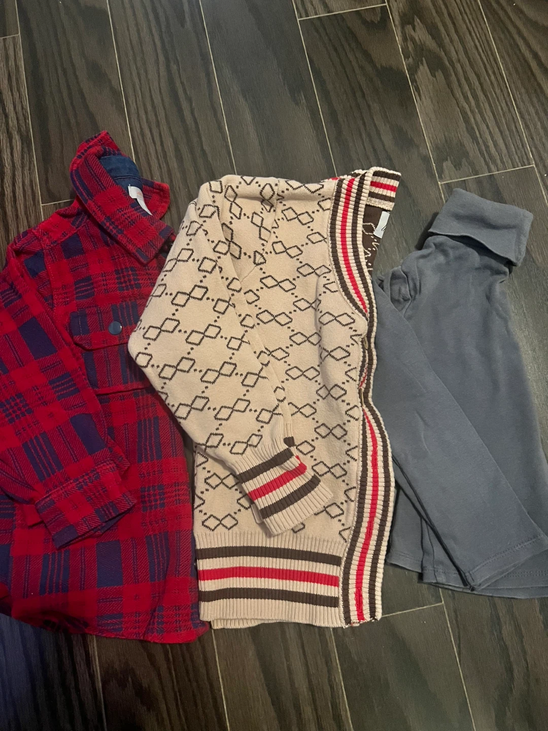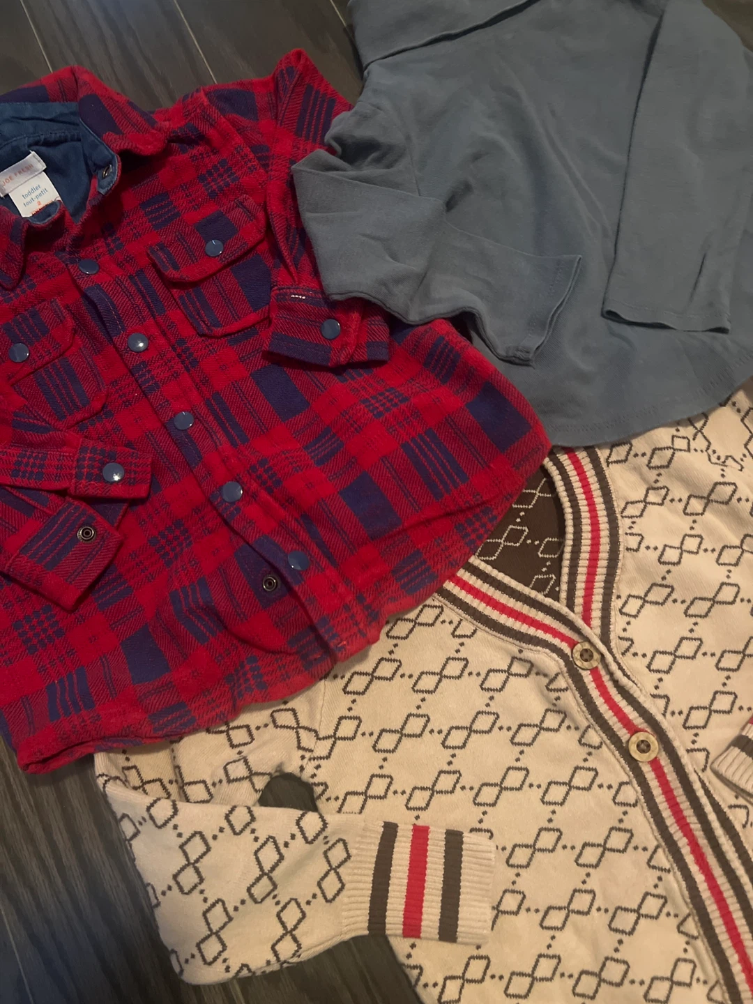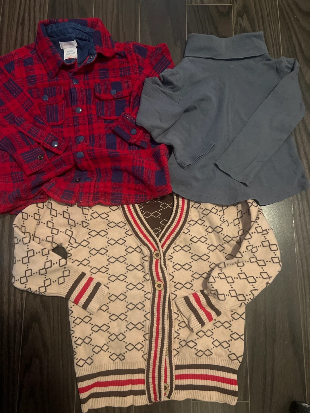 Selling a bundle of kids' clothing! Includes a red and blue plaid shirt, a long-sleeved blue shirt, and a patterned cardigan. Perfect for layering and keeping your little one warm and stylish