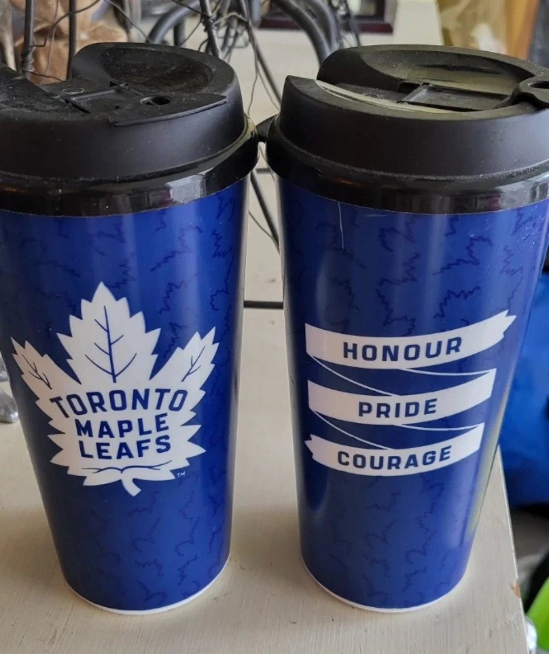 Selling a set of two Toronto Maple Leafs tumblers! Sippie cup lids. They're in great shape and ready to show off your team spirit. Perfect for keeping your coffee or tea warm on the go.