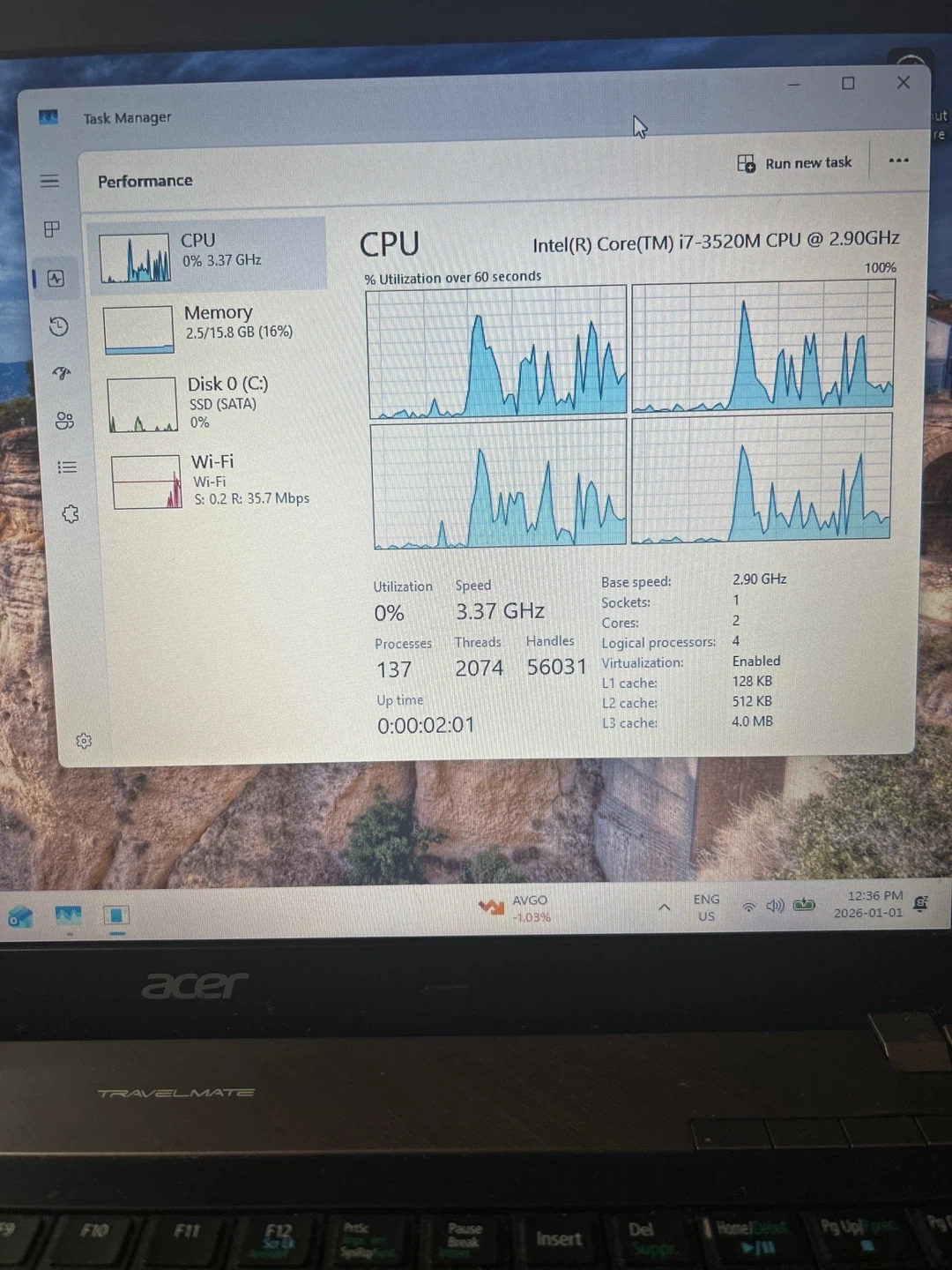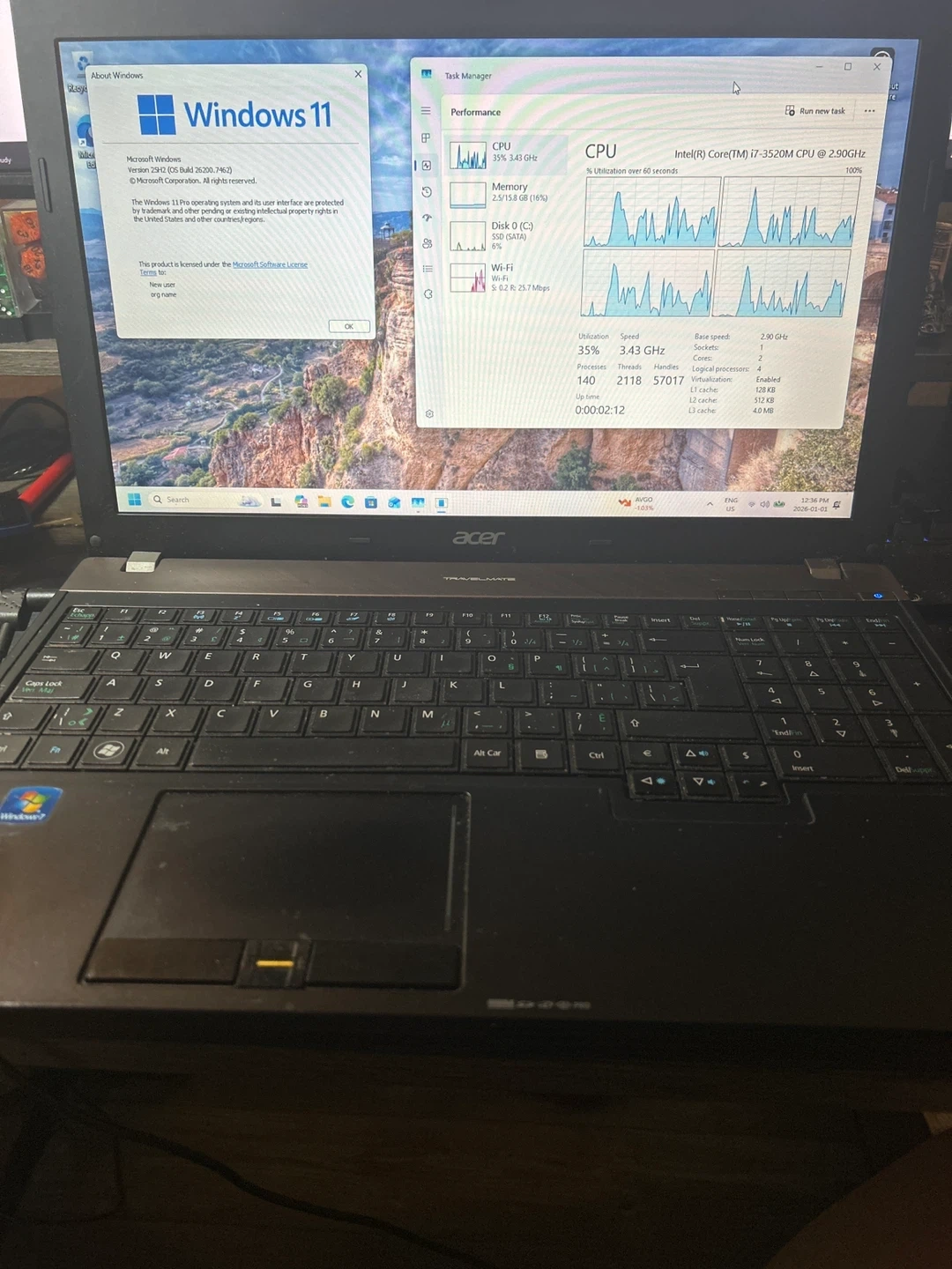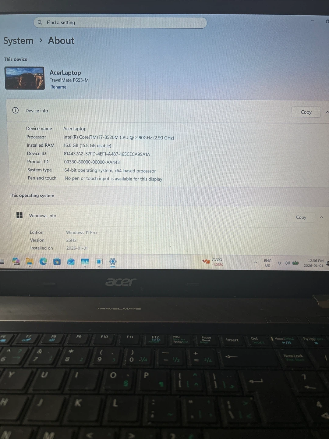 Selling an Acer TravelMate P653-M 17” laptop. It has an Intel(R) Core(TM) i7-3520M CPU @ 2.90GHz processor and 16.0 GB of installed RAM. It's running Windows 11 Pro, version 25H2. 447GB SSD.