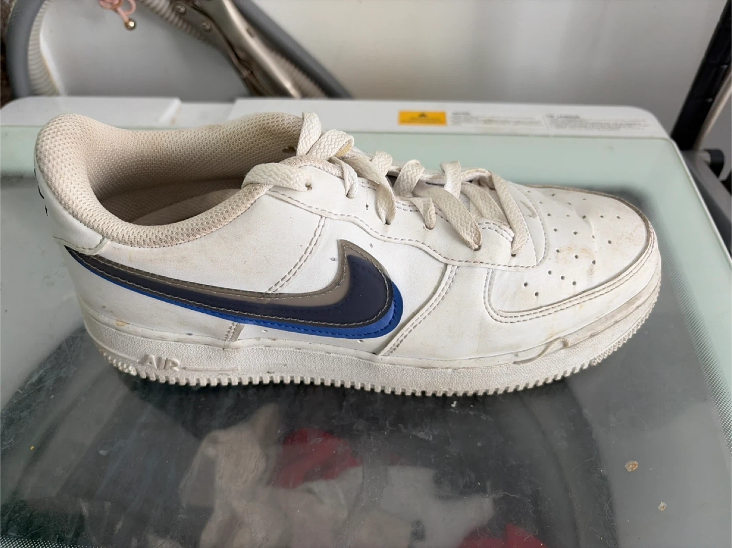 Selling a pair of Nike Air Force 1 sneakers in white with blue accents. They show some signs of wear, as pictured.