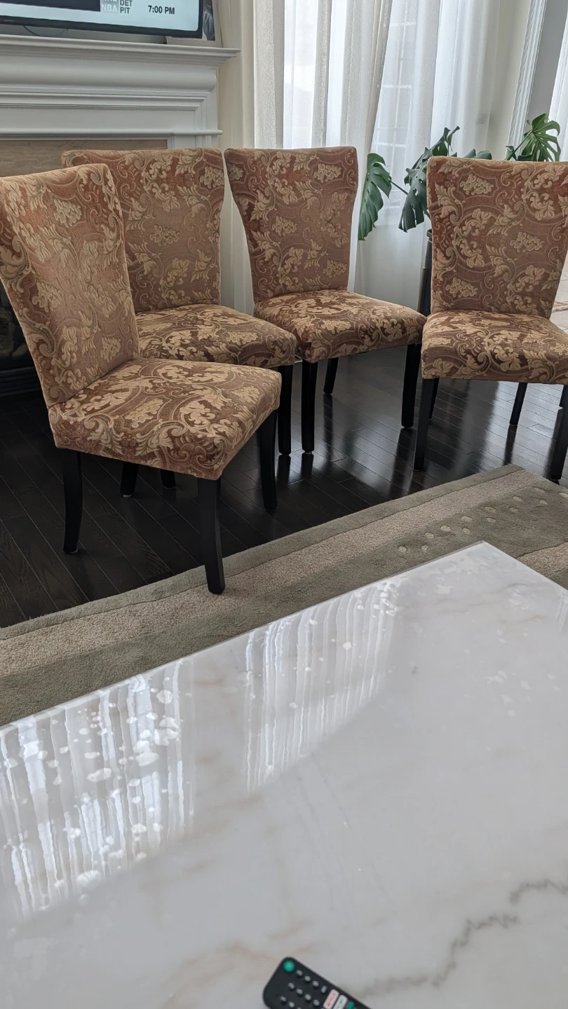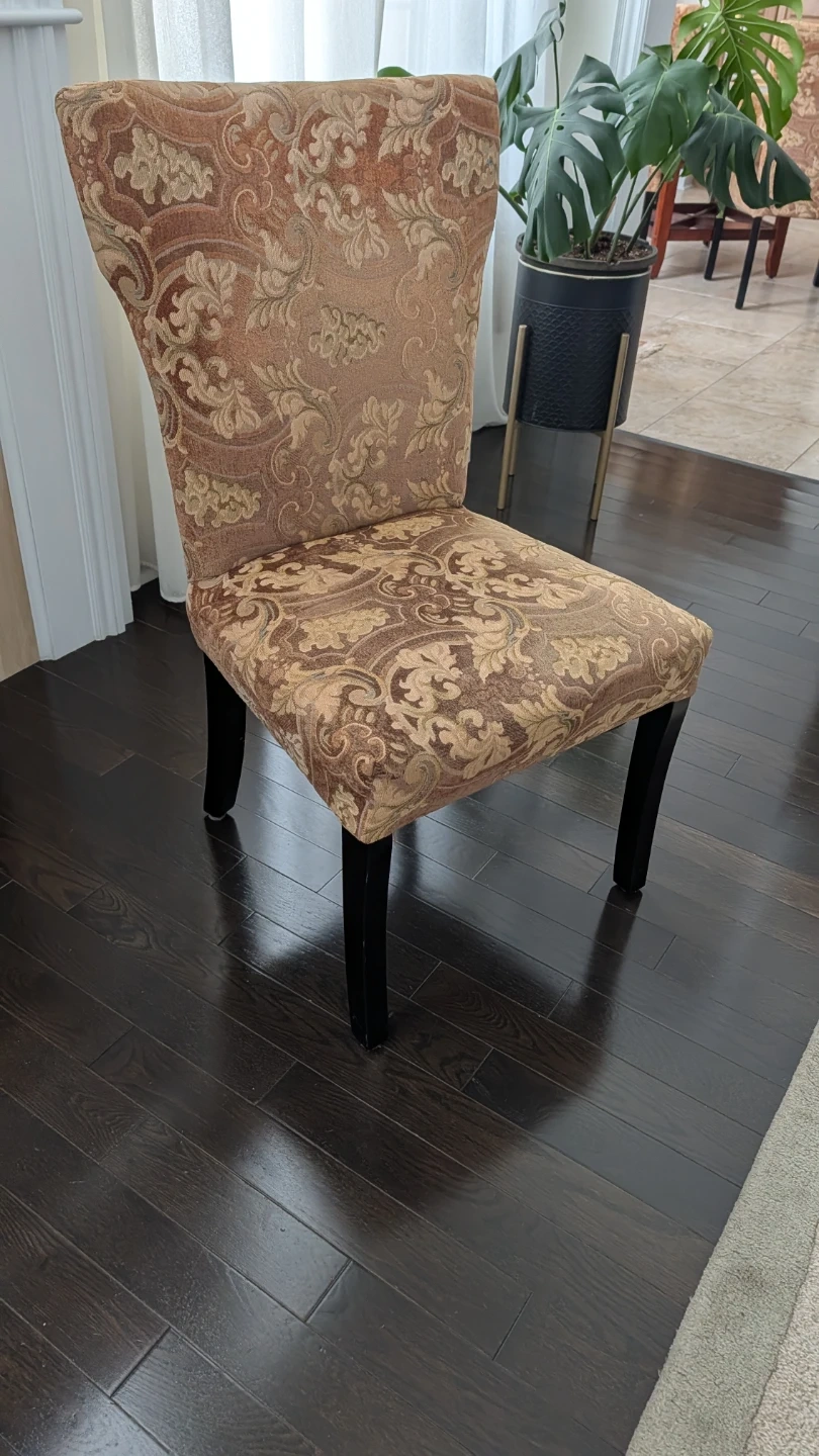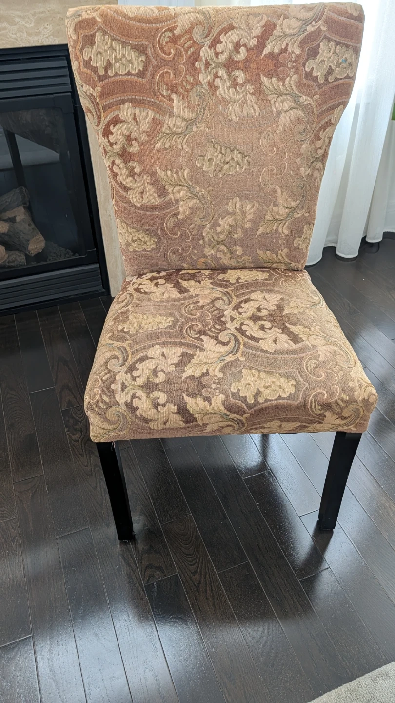 Selling four dining chairs with a patterned upholstery. Very comfortable. It has black legs and a high back. Perfect for adding a touch of elegance to your dining space!