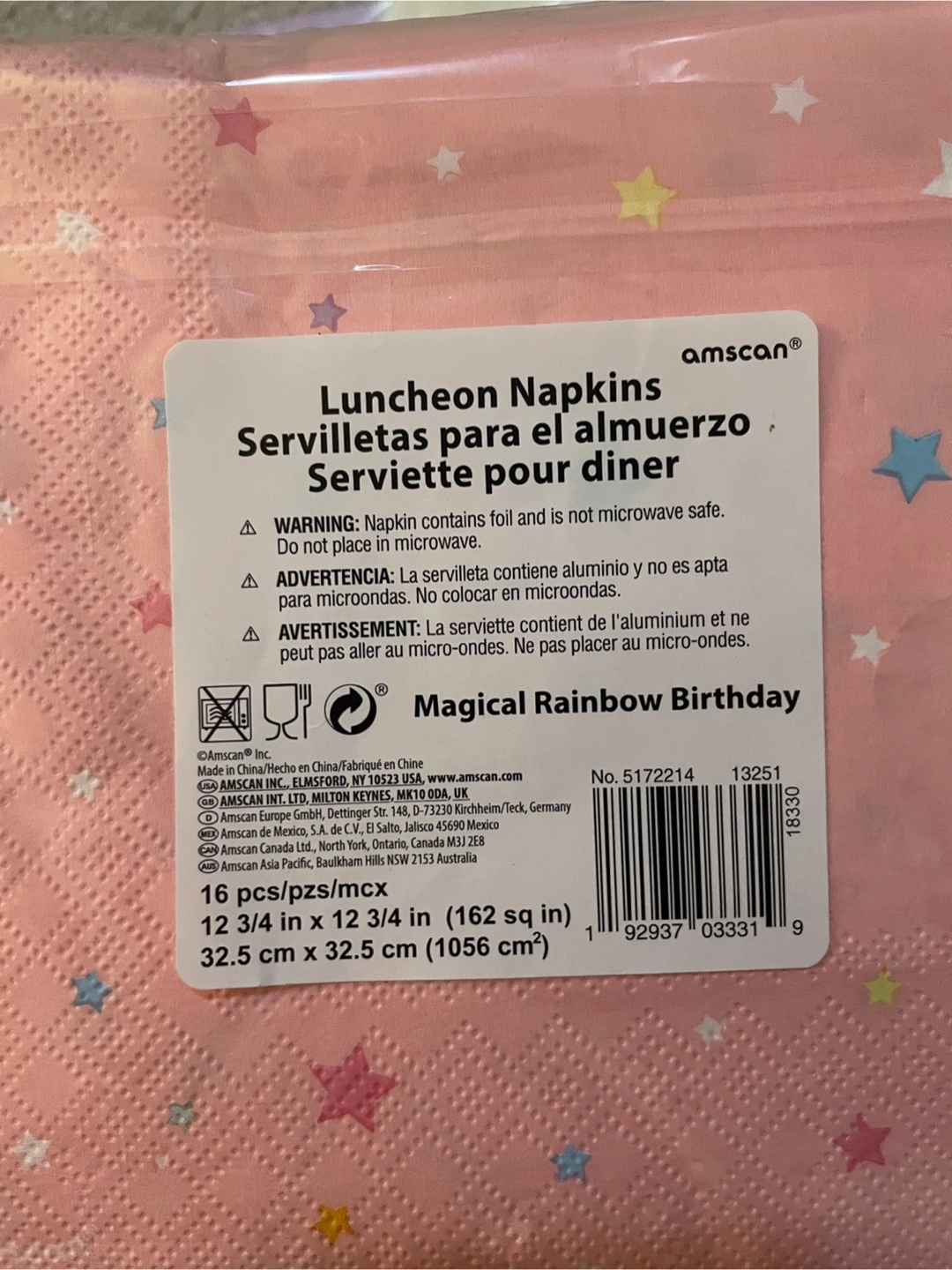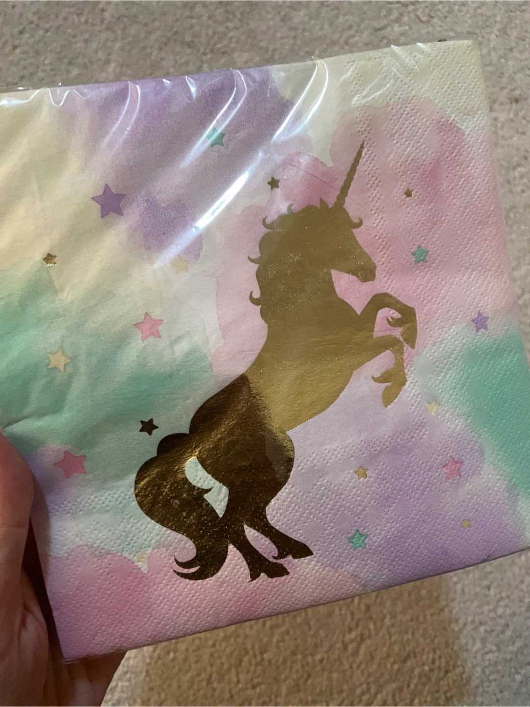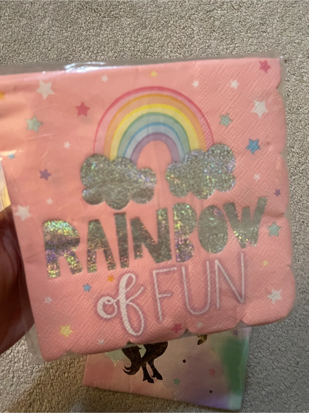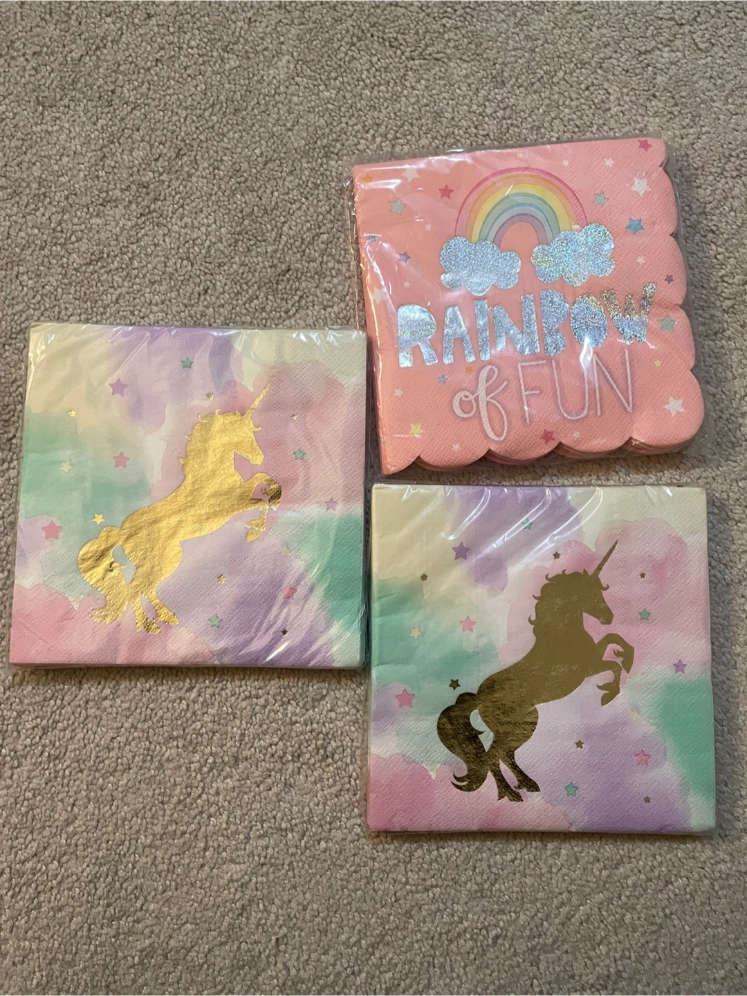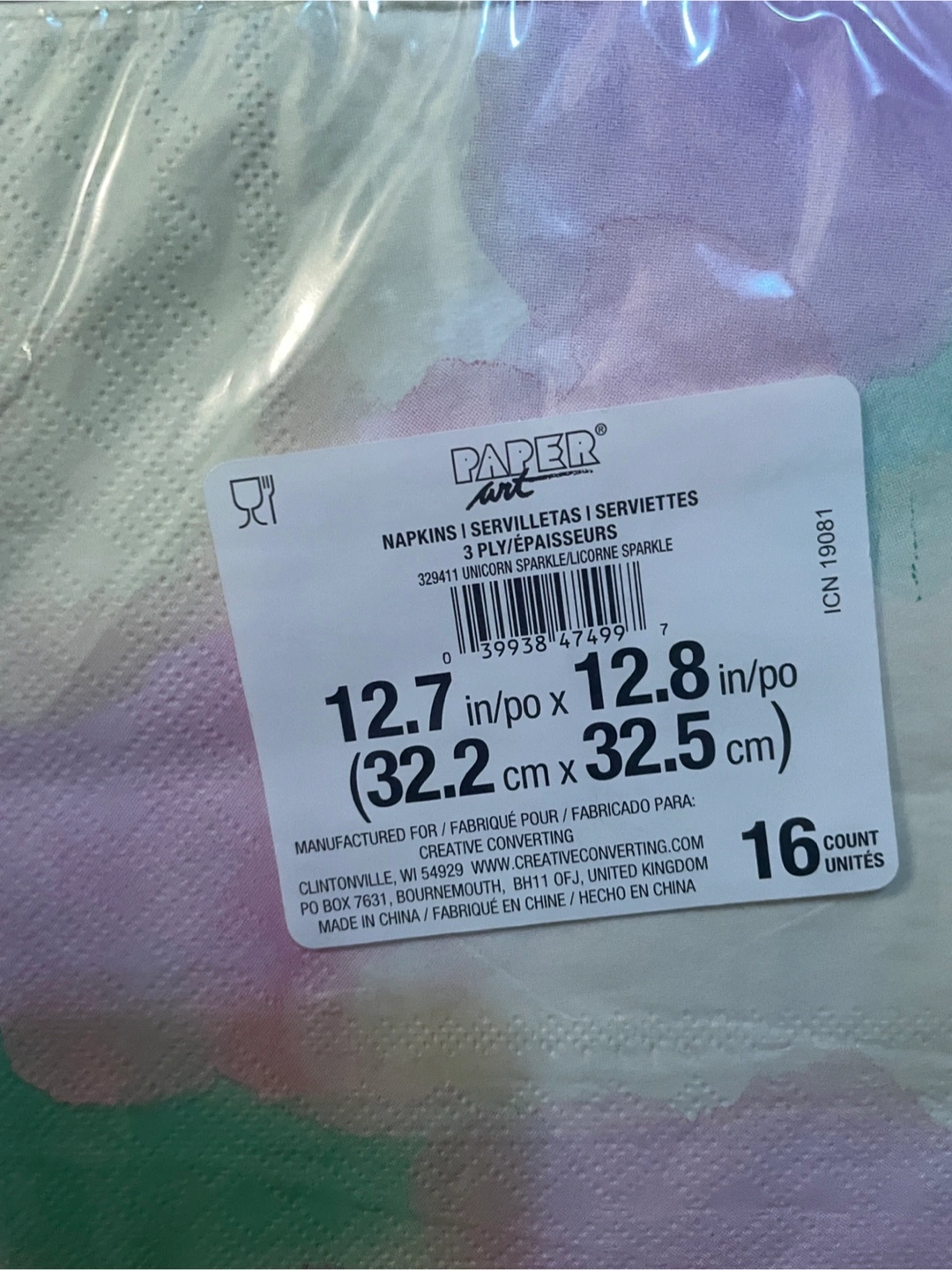 I have some cute napkins for sale! There's a pack of Amscan luncheon napkins with a magical rainbow birthday theme, and a pack of Paper Art napkins with a unicorn sparkle design. Each napkin measures approximately 12.7 x 12.8 inches (32.2 cm x 32.5 cm), and each pack contains 16 napkins