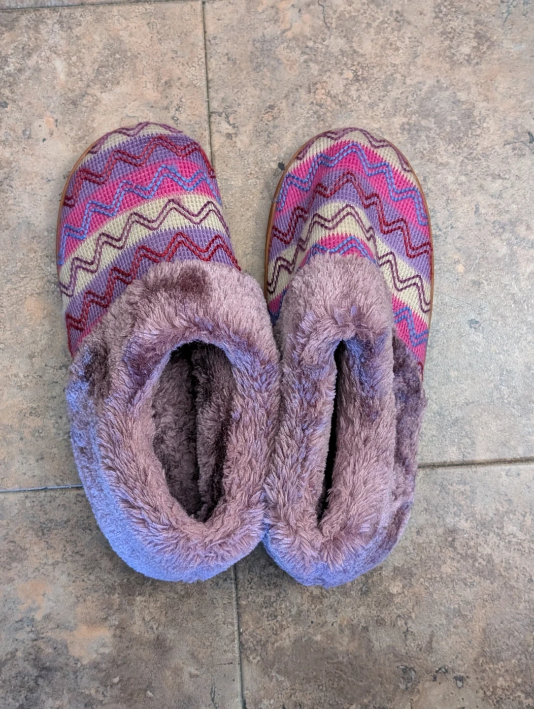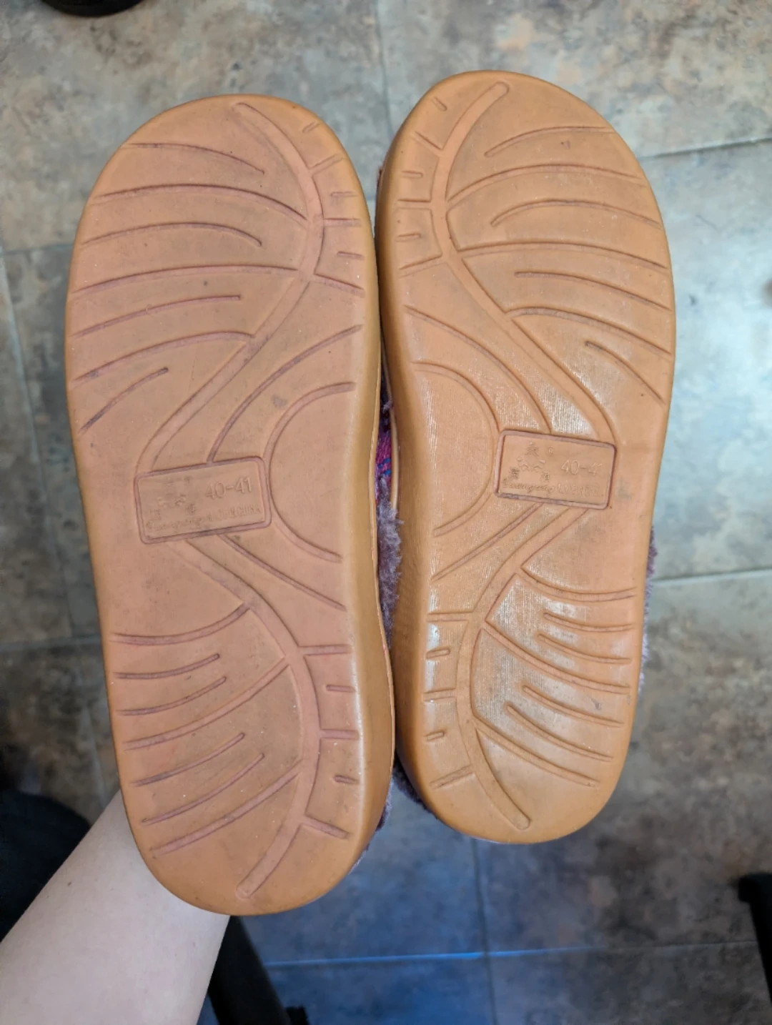 Selling a pair of cozy women's slippers. They are a size 9-10 (40-41). They have a soft, furry lining and a patterned outer fabric. Perfect for keeping your feet warm and comfortable!
