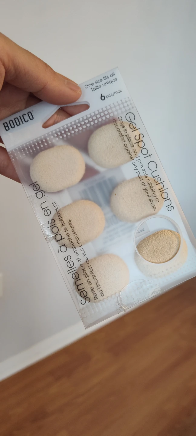 Here are some Bodico gel spot cushions! They stay in place and prevent rubbing or discomfort against any part of your shoe. One size fits all and there are 6 pieces in the package.