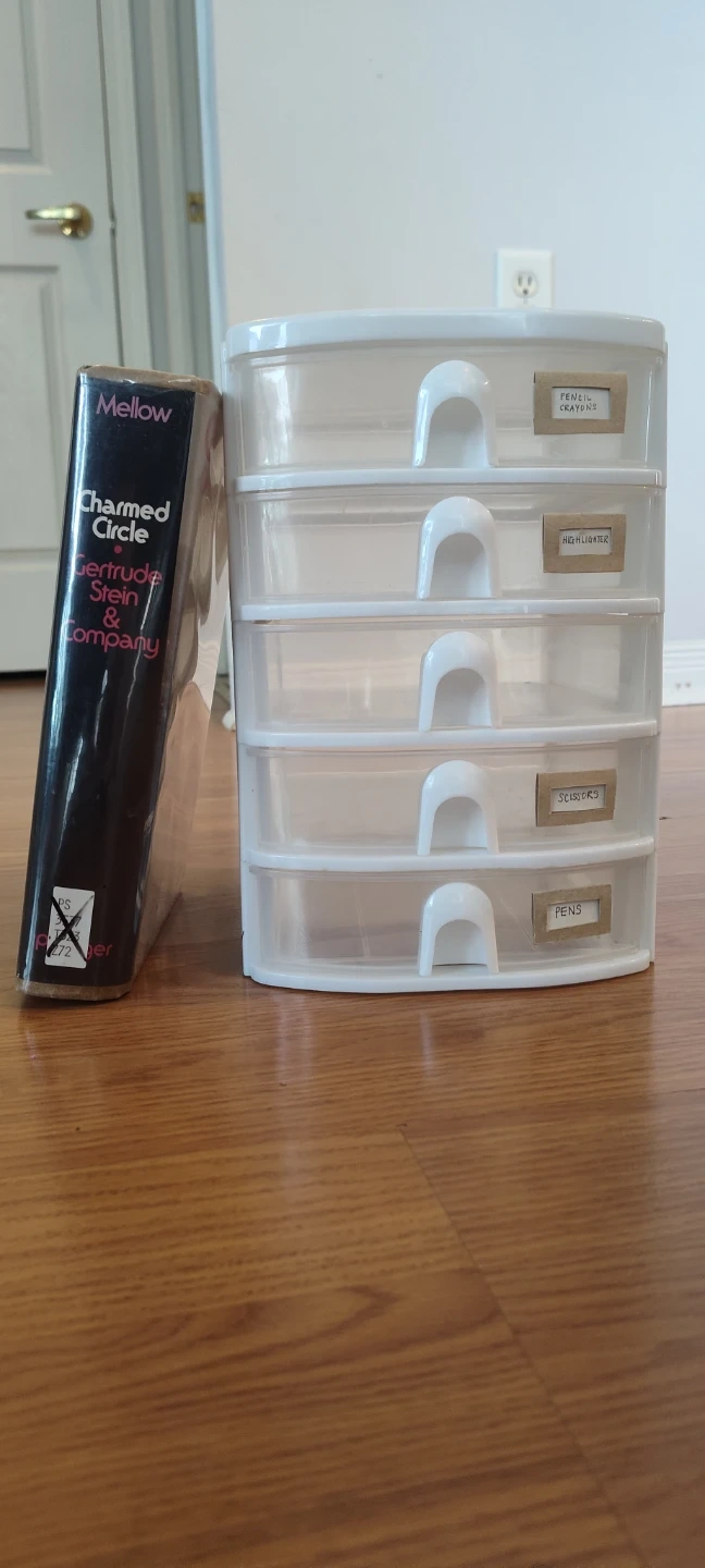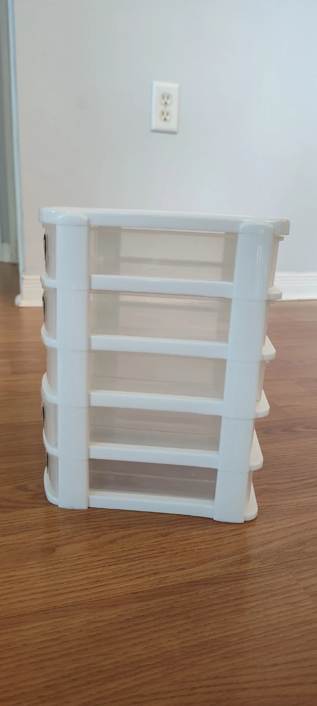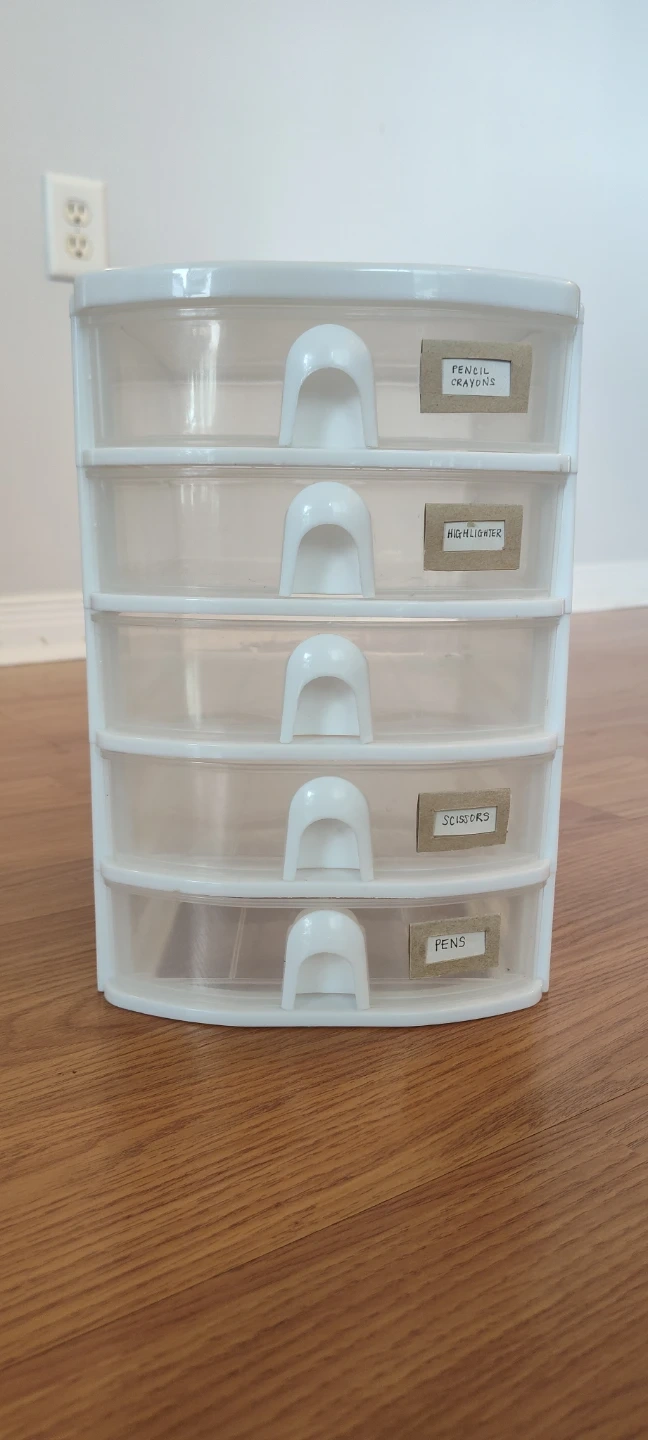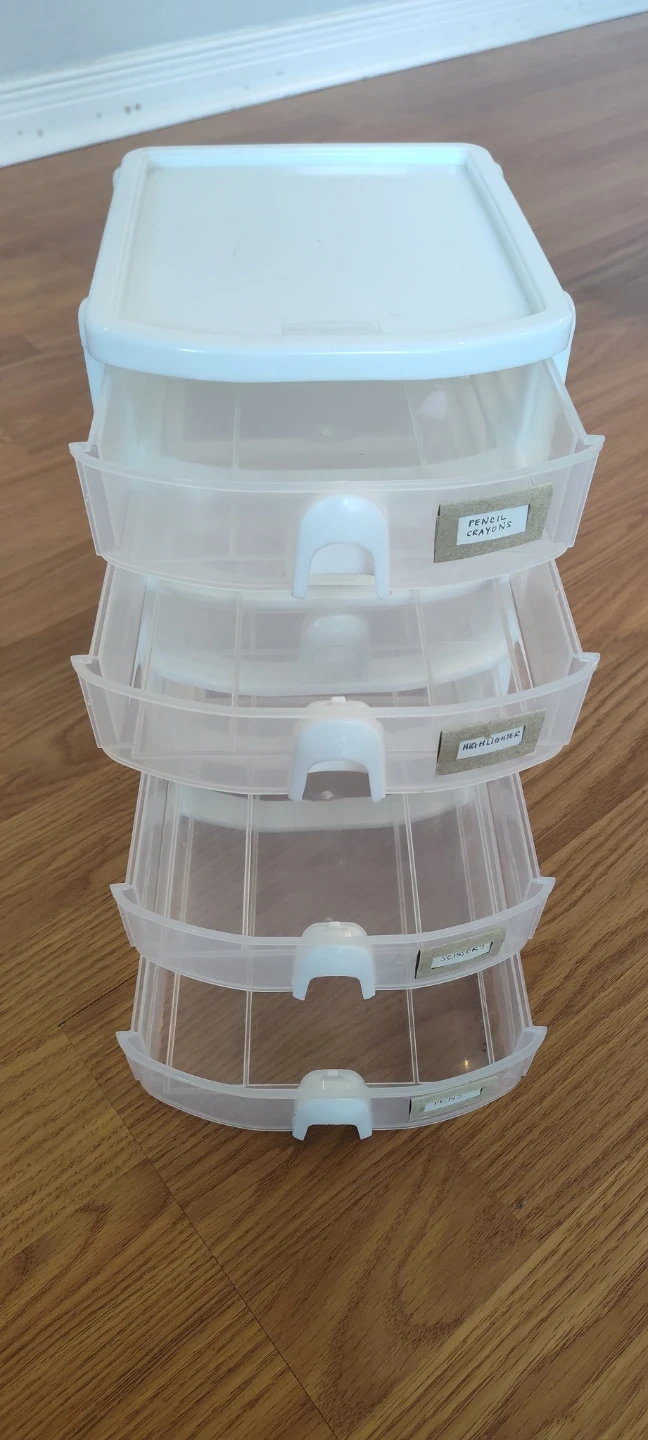 Here's a handy white plastic organizer with four drawers! Each drawer has a little handle and a label spot, perfect for organizing your pens, highlighters, scissors, and other small items. It's in great shape and ready to help you declutter! Dimensions: 26*18 cm.