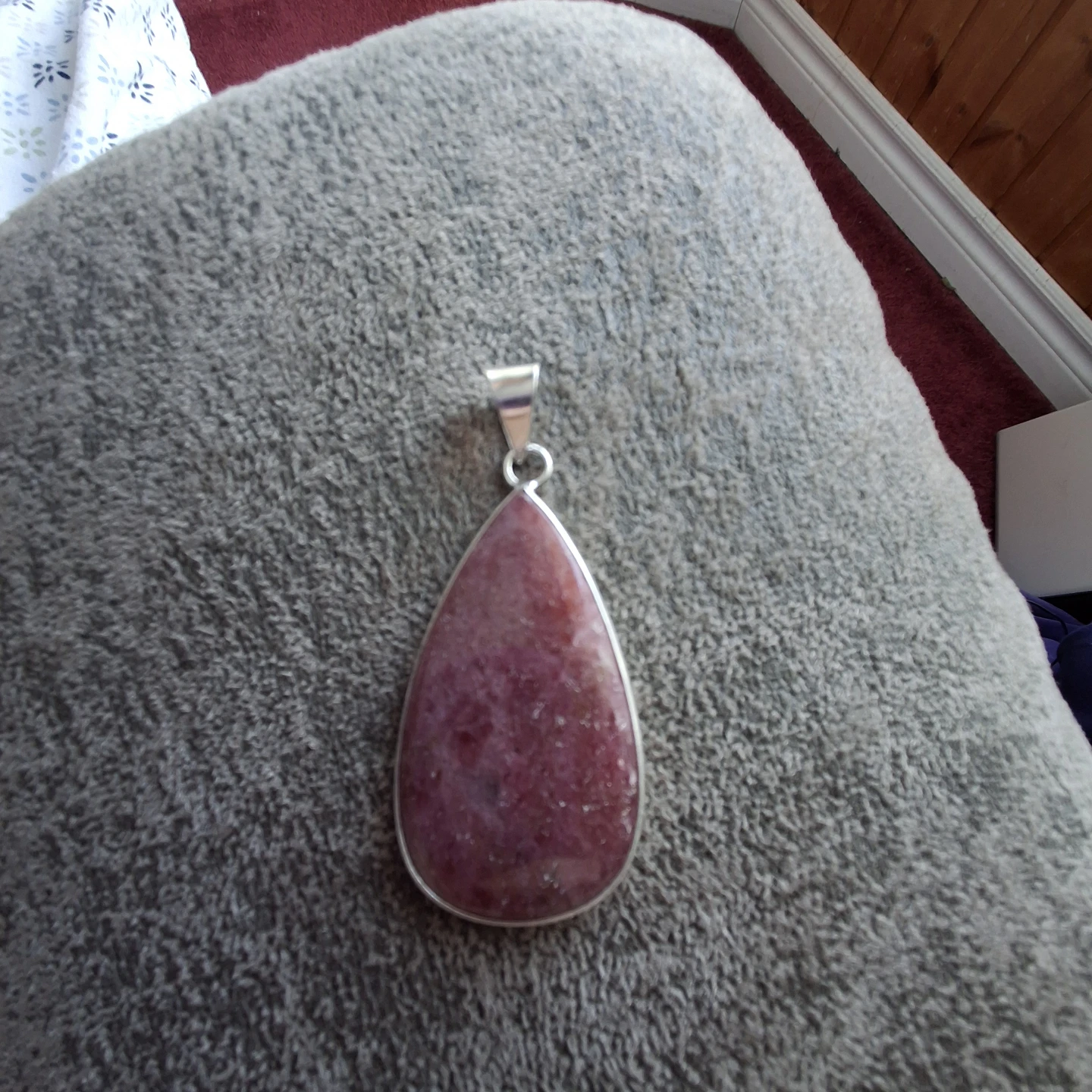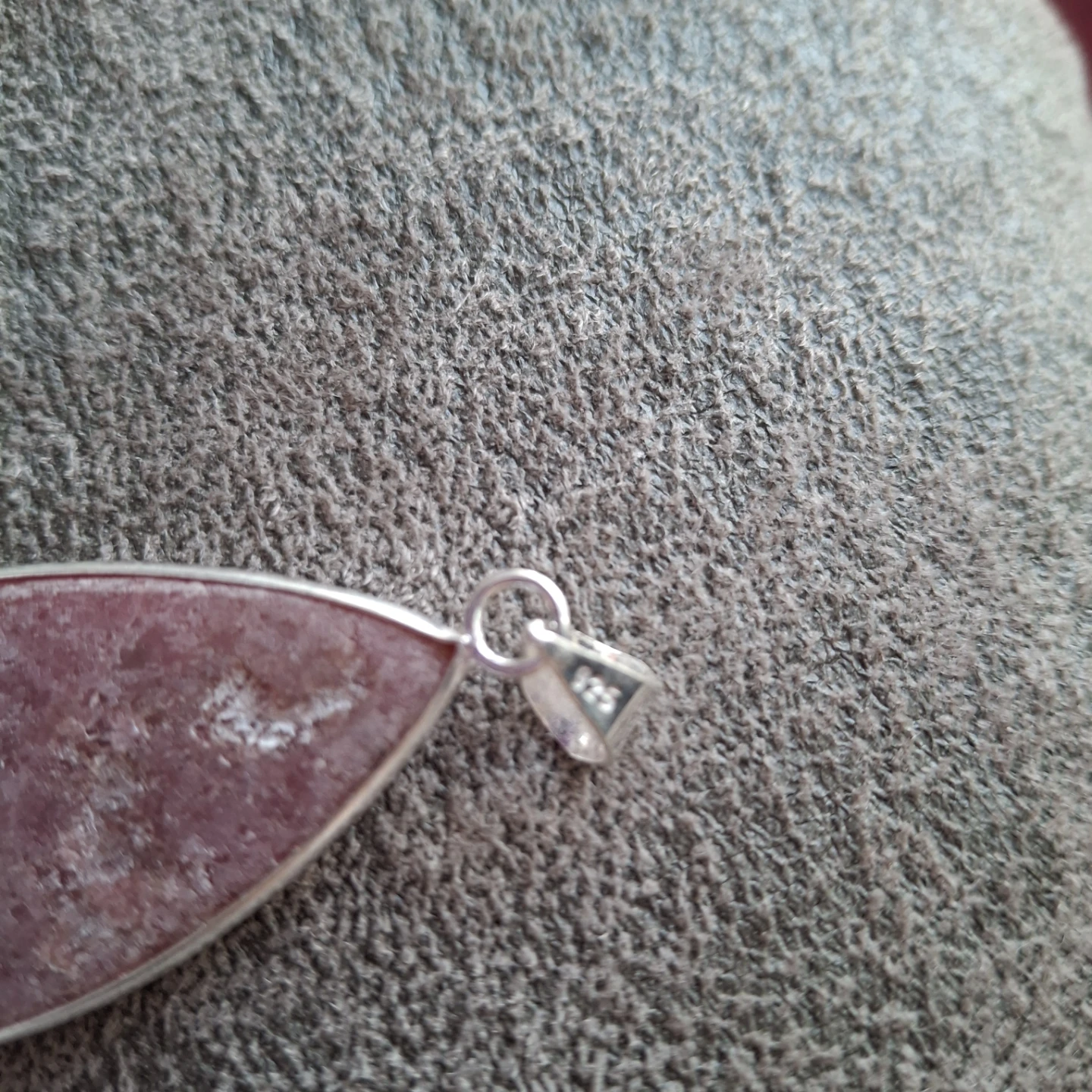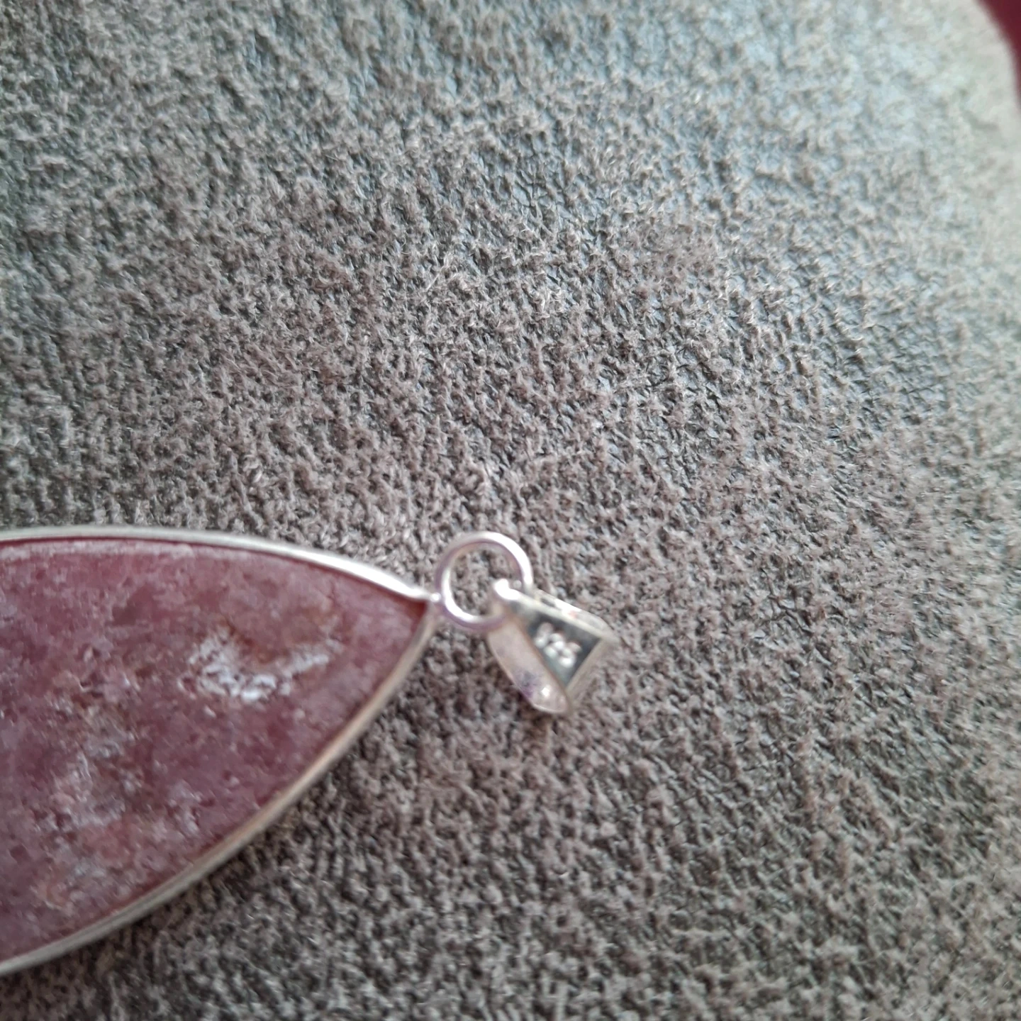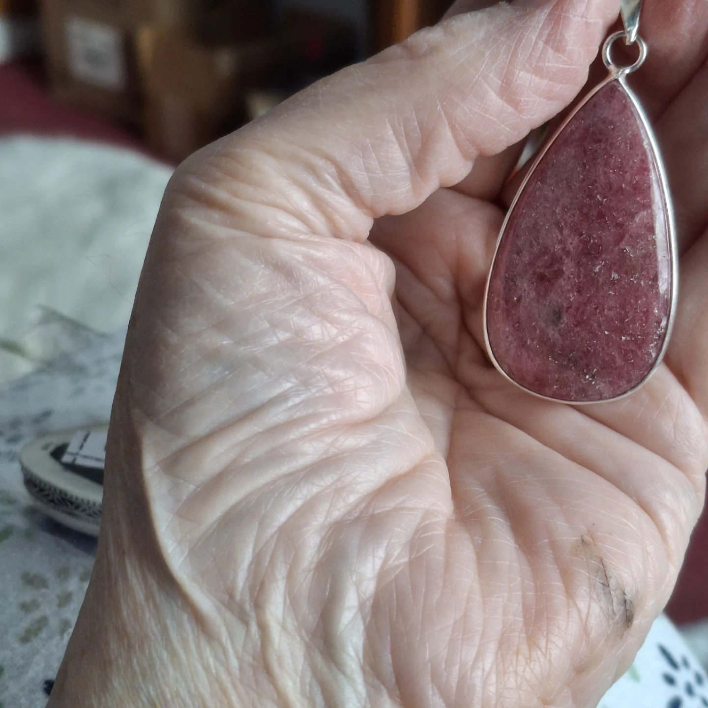 Beautiful teardrop-shaped rhodochrosite pendant set in sterling silver.