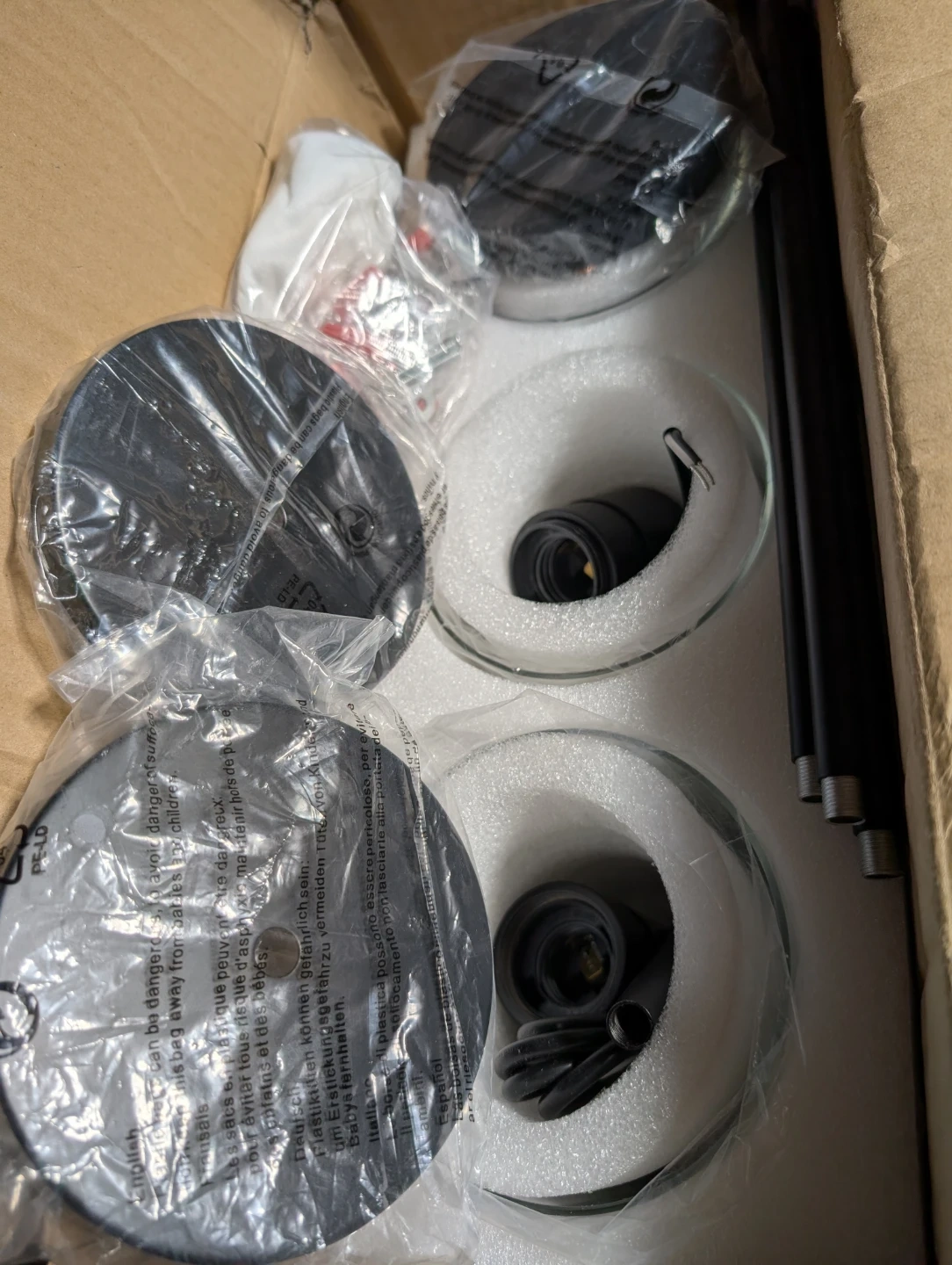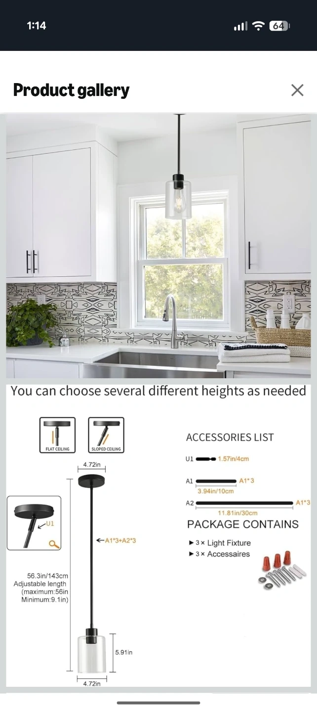 It's adjustable for sloped or flat ceilings. You can also adjust the height as needed. The package contains 3 light fixtures and accessories.