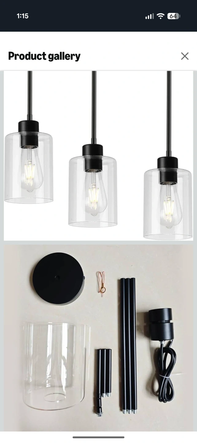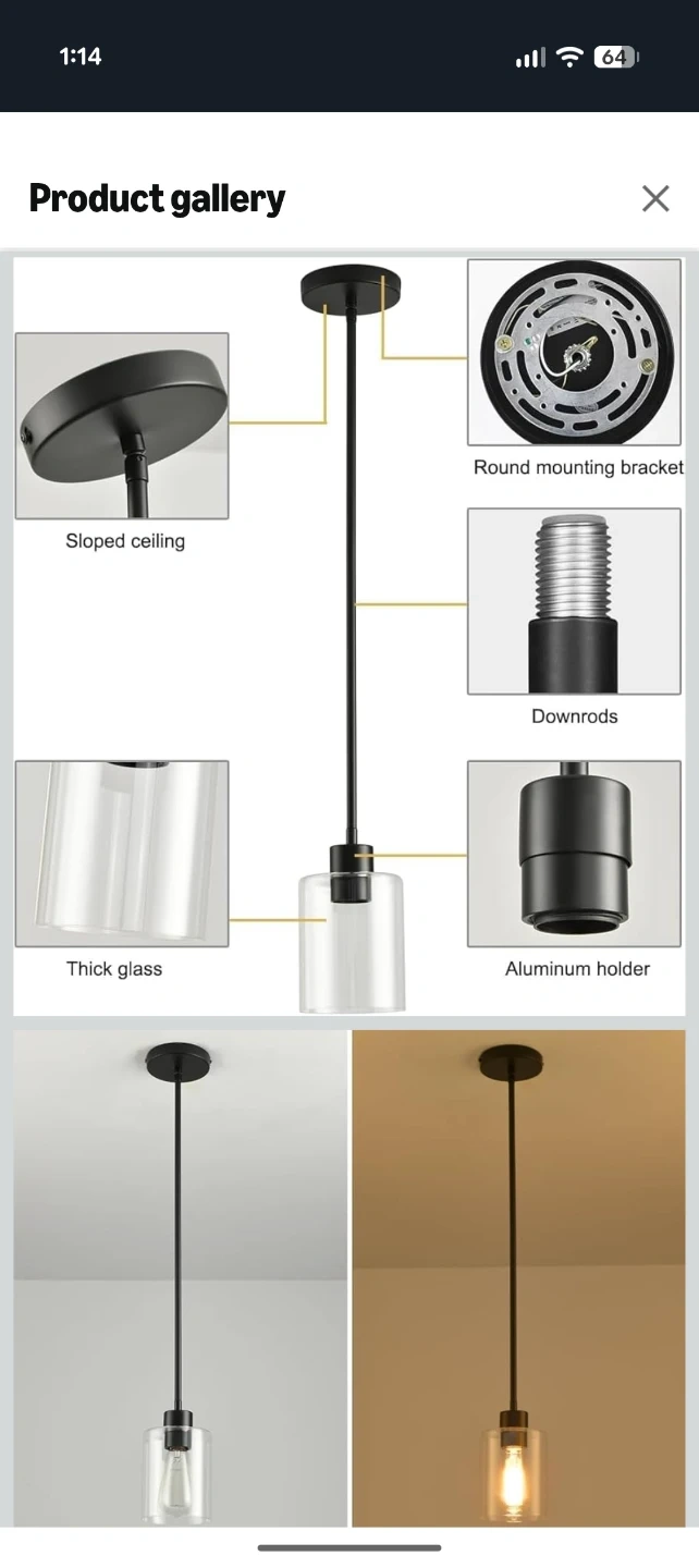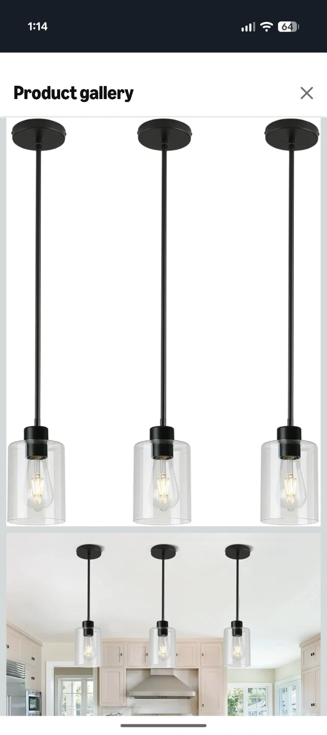 This pendant lighting fixture features a sleek black finish and a clear glass shade. It's perfect for adding a modern touch to any room.