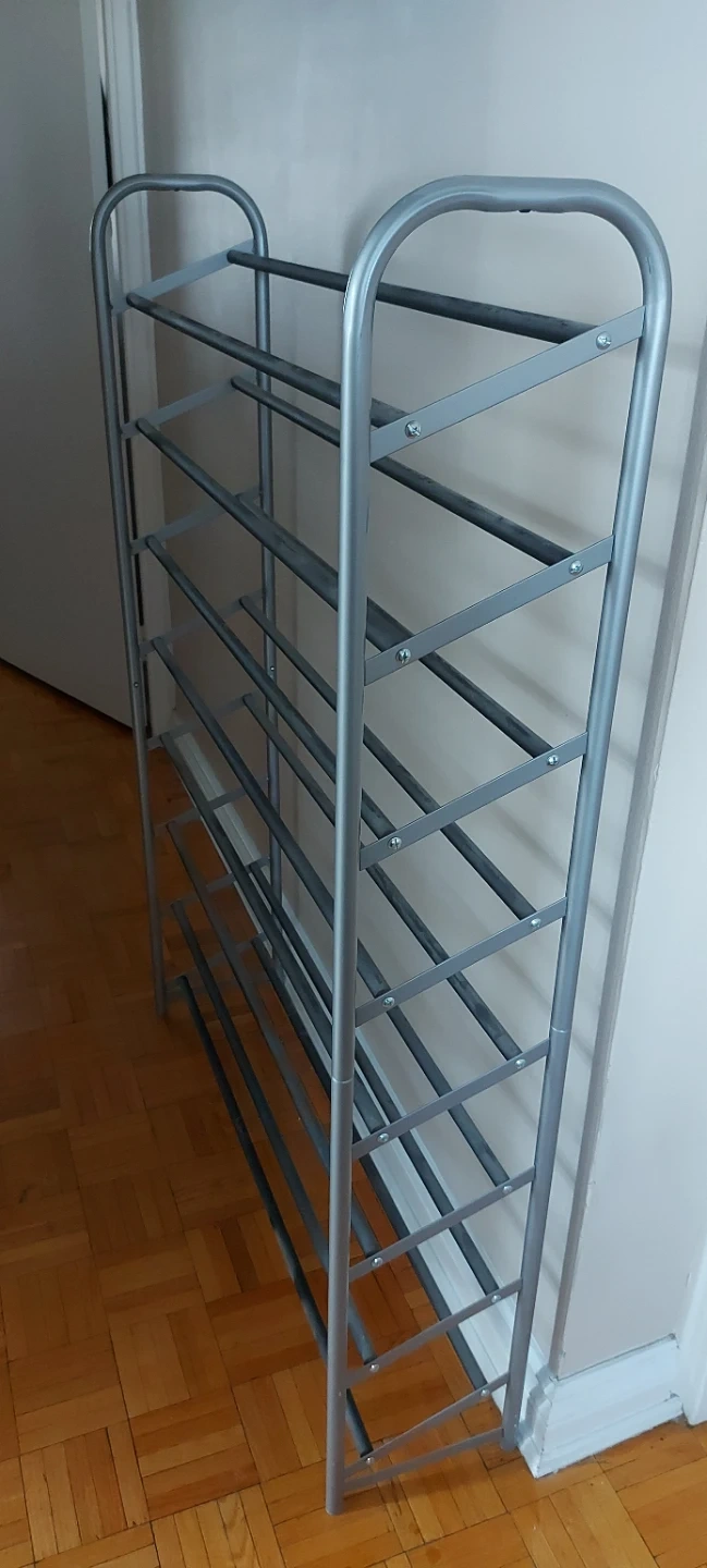 Here's a handy silver shoe rack! It's in great shape and ready to help organize your footwear. Perfect for keeping your entryway neat and tidy. Can hold up to 30 shoes. 35x39x9 inches
