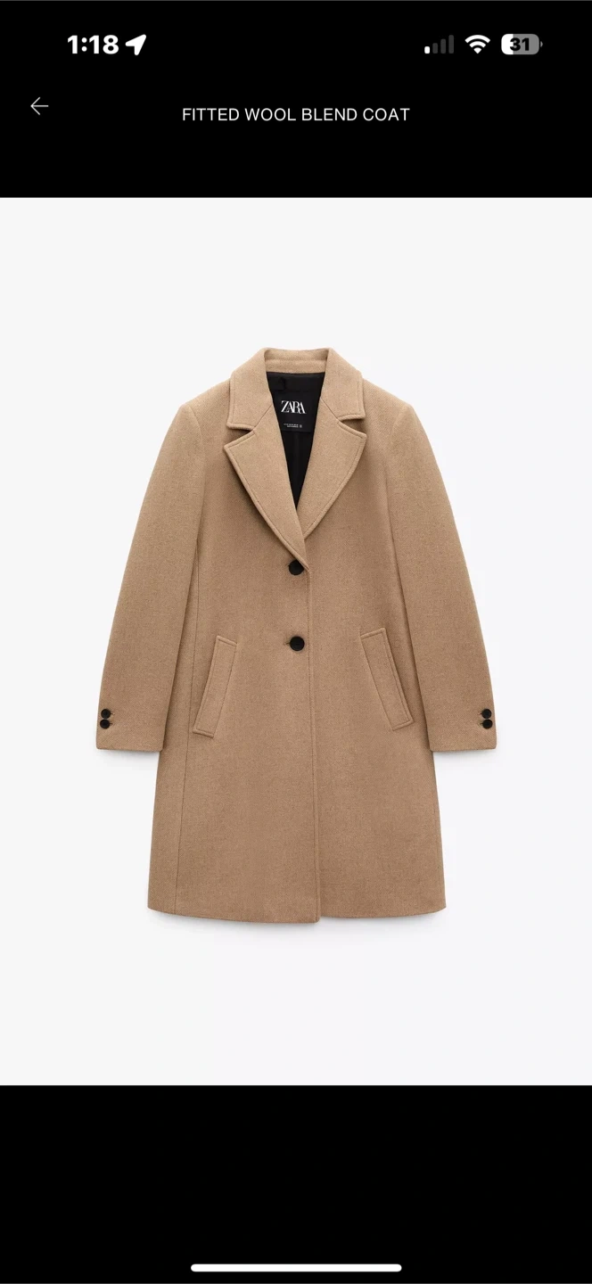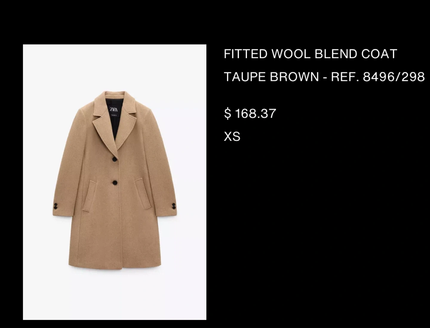 Selling a Zara fitted wool blend coat in a beautiful taupe brown color! It's a size XS and in great condition. The reference number is 8496/298. Originally bought for $168.37, this coat is a stylish and warm addition to any wardrobe
