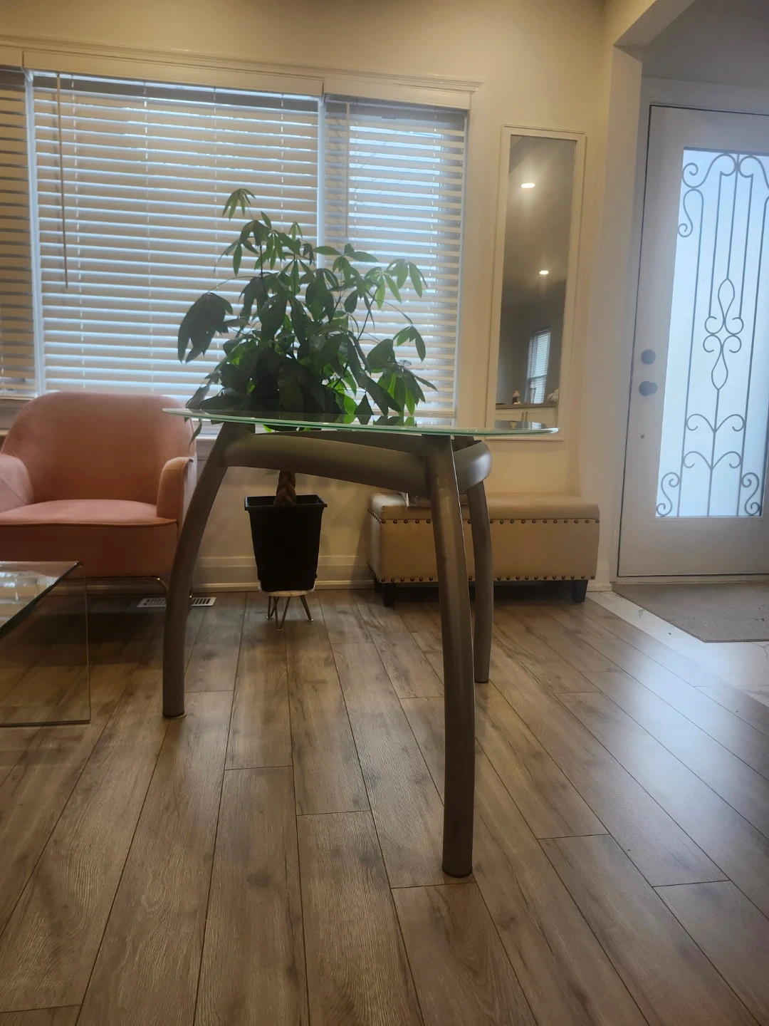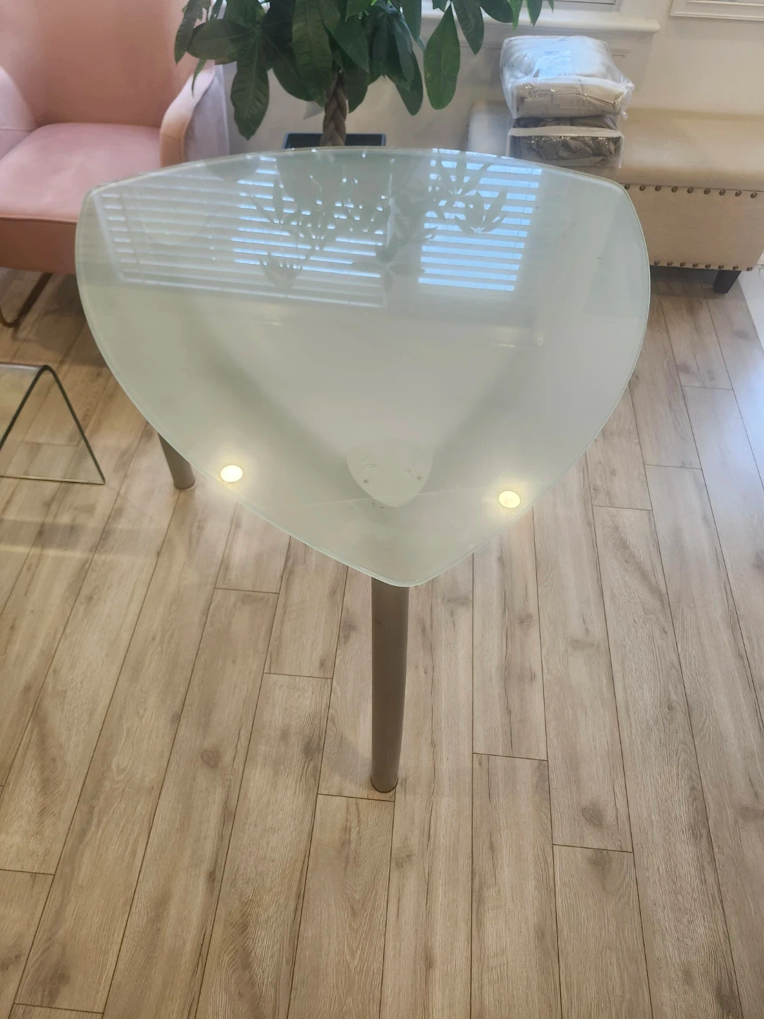 Selling a glass top dining table. It's in great shape and would be perfect for a smaller space. The table has a unique design and a sturdy base.