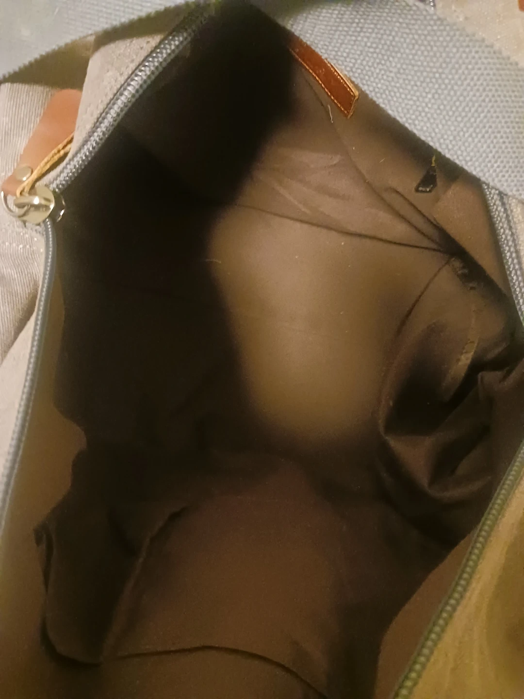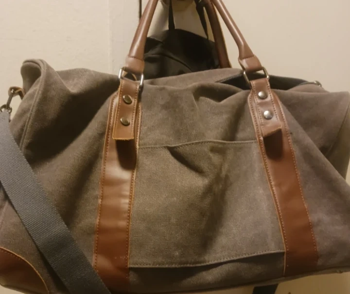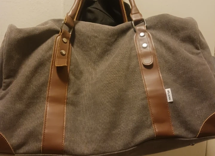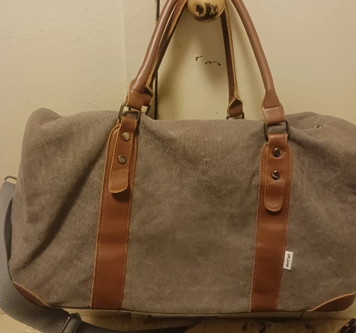 Here's a nice gray canvas duffle bag with brown leather accents. It has a shoulder strap and sturdy handles. Great for travel or the gym!