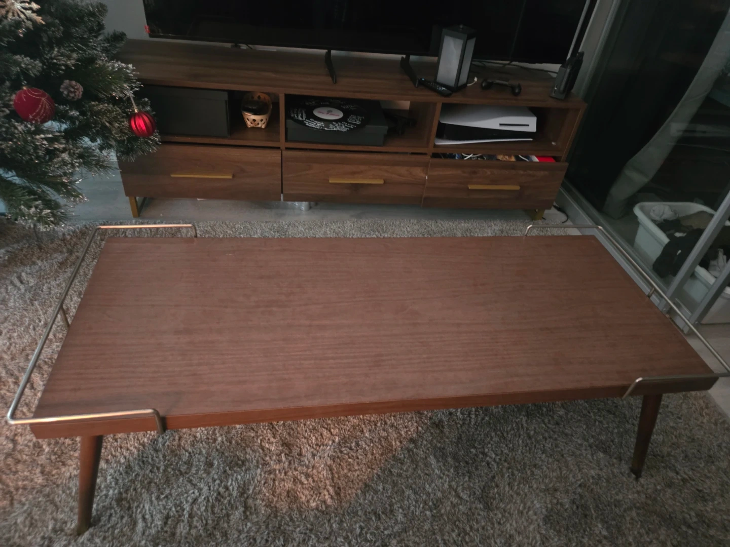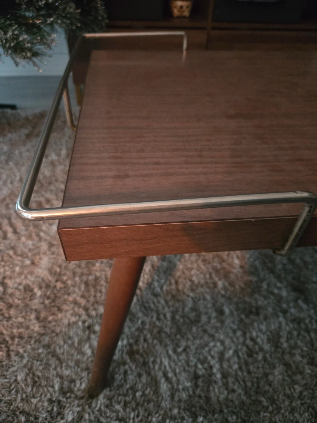Mid-century modern coffee table with a warm wood finish and metal side rails. Stylish and sturdy, perfect for a living room setup.