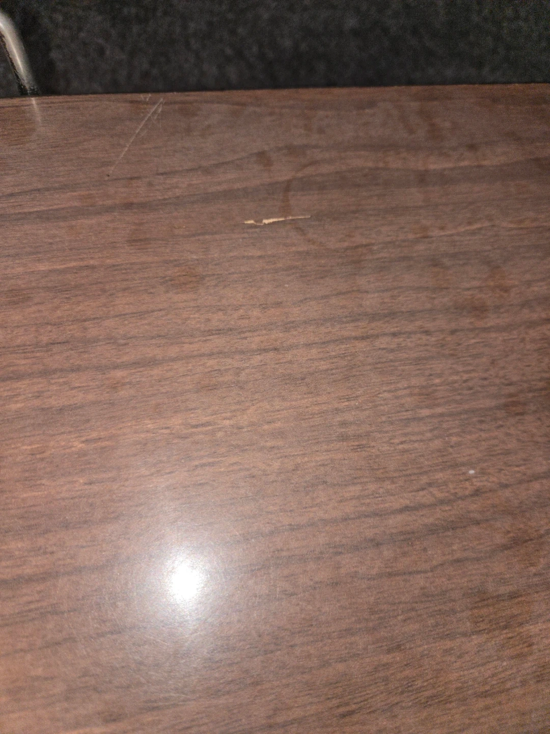 The table is structurally solid, but the tabletop has visible grease stains and marks and will require a thorough cleaning. There is also a small surface chip/scratch (see photos). These are cosmetic only and do not affect its stability or use.