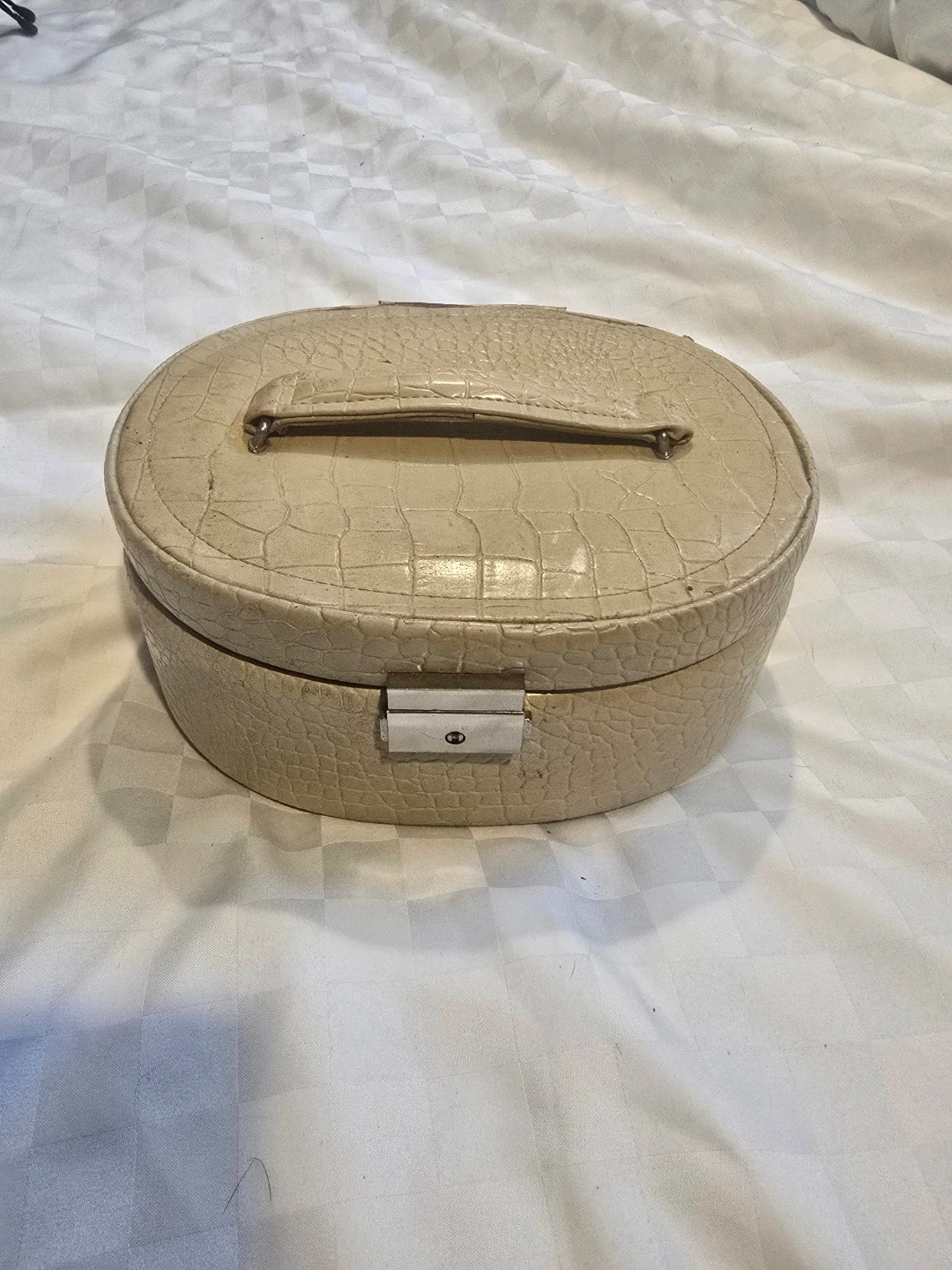 Here's a cute beige jewelry box! It's oval-shaped and perfect for keeping your jewelry organized. It has a mirror inside and different compartments for rings, necklaces, and other small items. It's in great condition and ready for a new home! $15