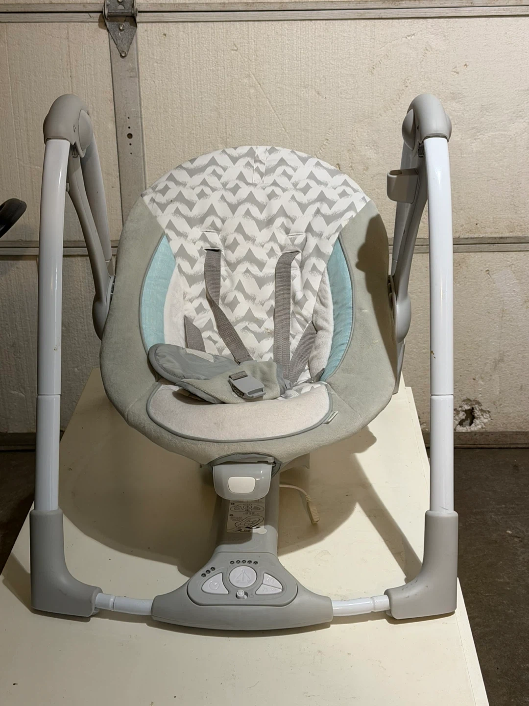 Selling a gently used baby swing in grey and white. It's in great condition and ready for a new little one! It has a comfortable seat and soothing motion to help your baby relax.