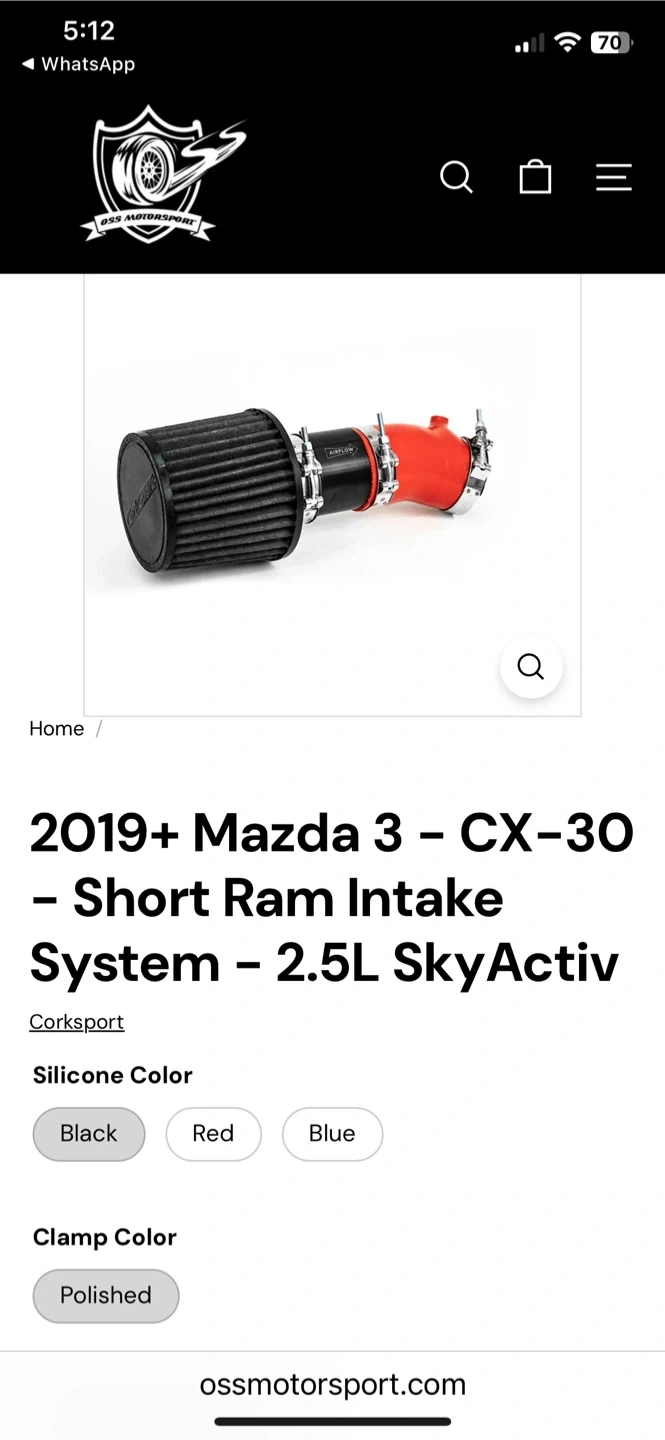 Selling a CorkSport Short Ram Intake System for a 2019+ Mazda 3 or CX-30 with a 2.5L or 2L SkyActiv engine. The silicone color is black, and the clamp color is polished. It is in good condition and ready to install!