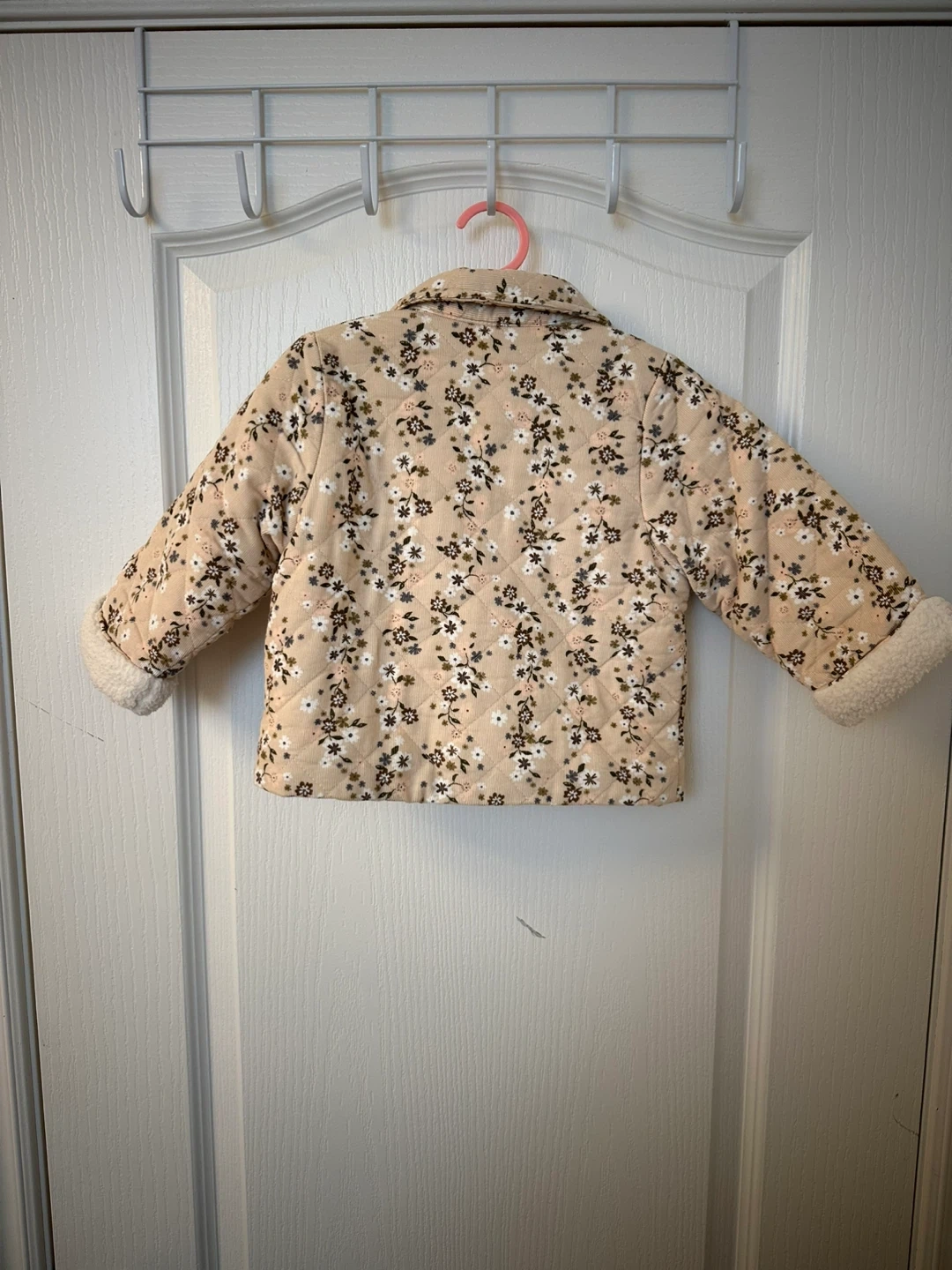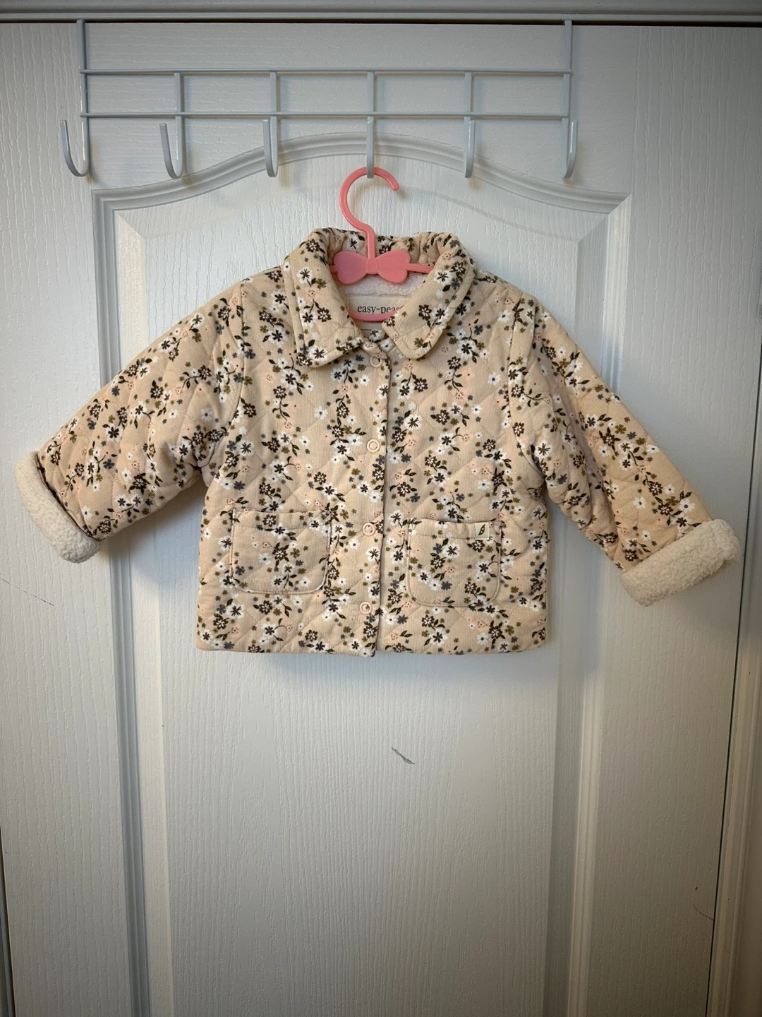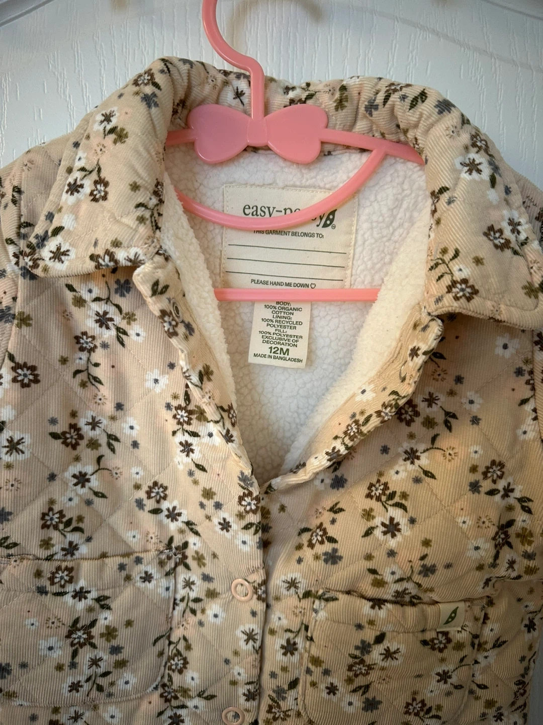 Selling a cute baby jacket from Easy-Peasy! It's size 12M and features a lovely floral pattern. The jacket is made with 90% organic cotton and 10% recycled polyester, exclusive of decoration. It's in great condition and ready for a new little owner
